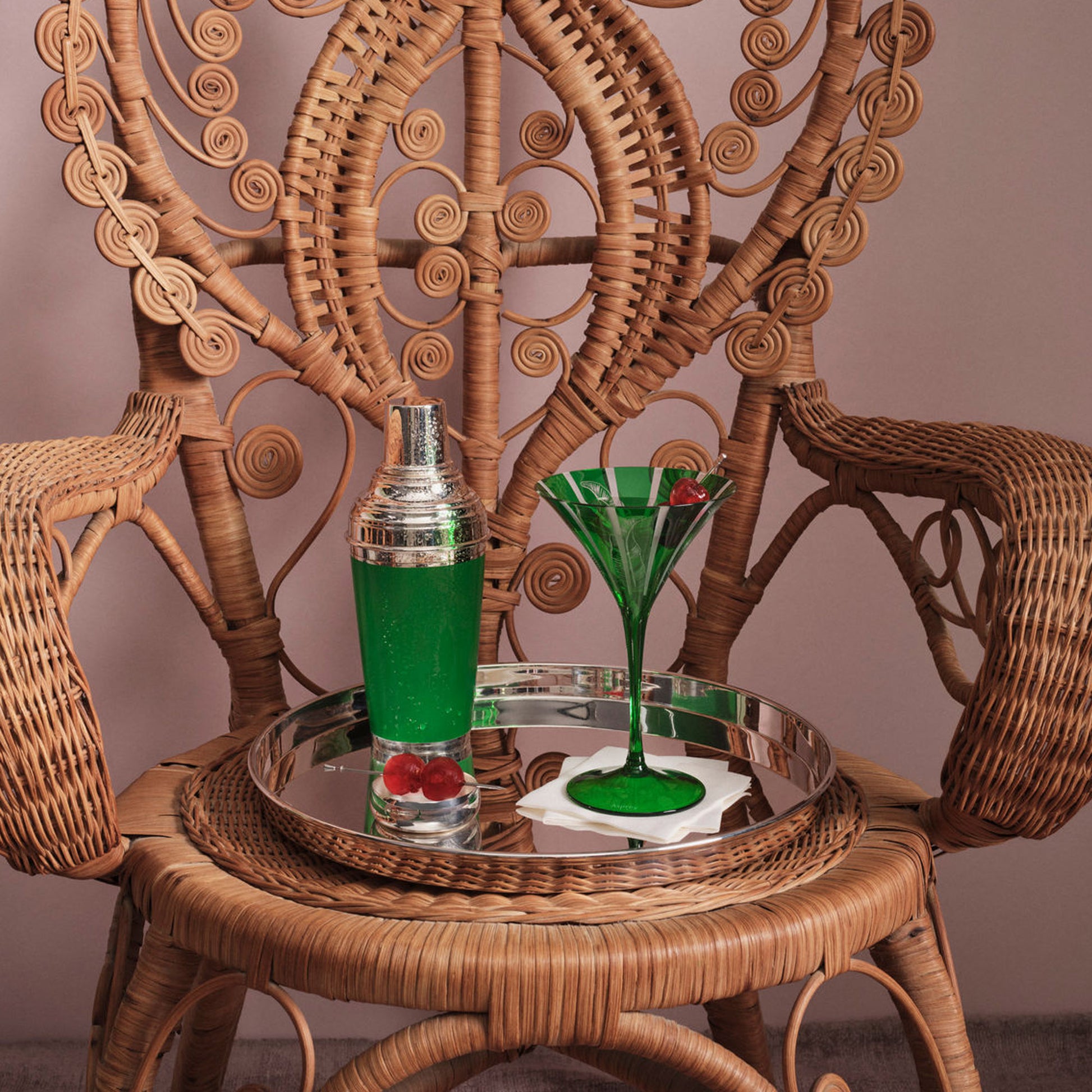 Enrich your drinking experience with the exclusive design of Asprey's Beverly Hills Martini Glass. Crafted through a multi-stepped sand blasting process, this mouth-blown, lead-free crystal glass showcases a vibrant green hue and a finely detailed banana leaf design. The innovative sand blasting technique propels fine sand particles with precision, sculpting a textured surface that enhances its visual appeal. Asprey's commitment to quality shines through, offering a barware essential that seamlessly blends expert craftsmanship with an exclusive and distinctive design, setting your collection apart.