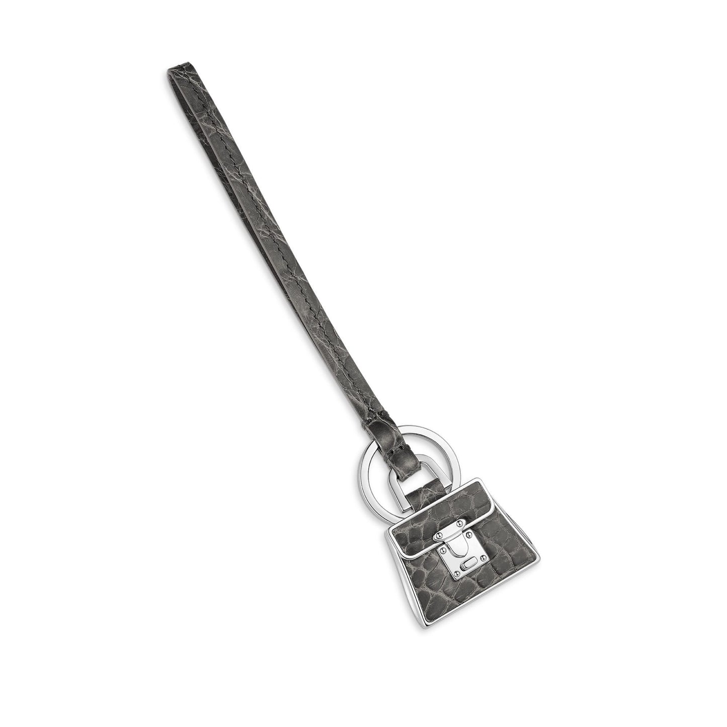 The Asprey Bond Street 167 mini charm and key holder in silver grey crocodile is expertly crafted by skilled artisans. The micro miniature Asprey handbag on this key holder is sculpted in palladium plated brass and expertly inlaid with luxurious silver grey crocodile. It is perfect for adding a playful touch to any set of keys or handbag. Asprey is known for its tradition of excellence and this charm & key holder is a shining example of this commitment to quality and craftsmanship. This accessory is sure to be treasured for years to come.