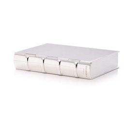 The Book Box in hallmarked sterling silver presents as a refined, book-shaped case that opens to reveal a discreet compartment for keepsakes or fine jewellery. With polished surfaces and subtle detailing it blends literary form with elegant functionality. A timeless addition to the home library or dressing table, it reflects the enduring craftsmanship of Asprey.