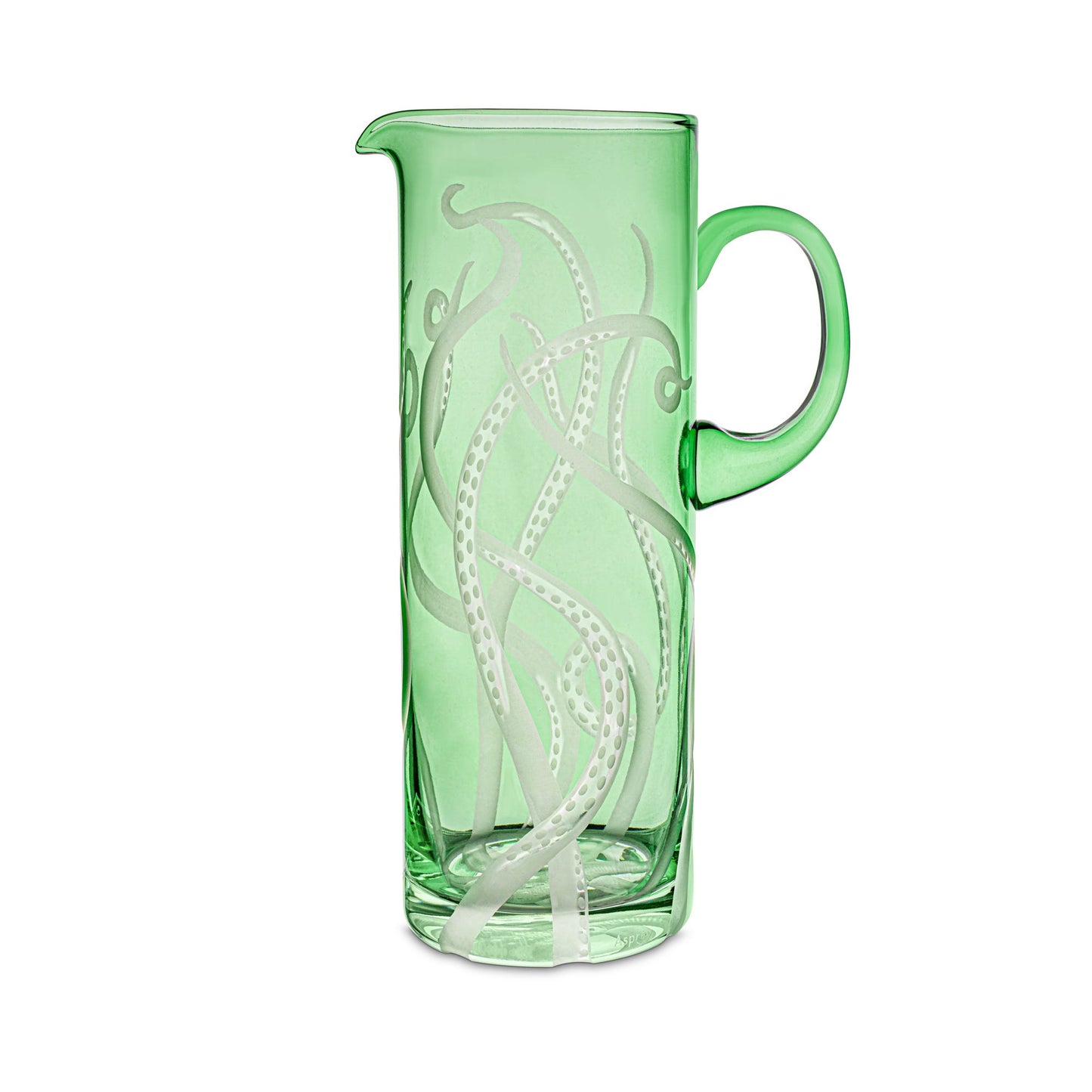 Expertly crafted in Asprey's renowned workshops to the highest standards, the Asprey jug is an elegant addition to the Octopus collection. Made from sea green coloured lead-free crystal, this jug showcases a hand-engraved octopus design that wraps around the exterior, revealing its intricate beauty from every angle. Crafted using traditional mouth-blown techniques, this piece showcases Asprey's commitment to timeless design and exceptional quality. The diamond wheel engraving method employed by our skilled artisans adds remarkable depth and detail, resulting in a truly artistic piece.