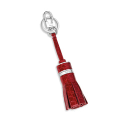 The Asprey Bond Street tassel charm and key holder in cognac crocodile is expertly crafted by skilled artisans. This hand-made tassel replicates the one found on the Asprey 167 collection of handbags. It features palladium plated brass and an exclusive Asprey clip for easy attachment. It is perfect for adding a playful touch to any set of keys or handbag. Asprey is known for its tradition of excellence and this charm & key holder is a shining example of this commitment to quality and craftsmanship. This accessory is sure to be a beloved companion for years to come.