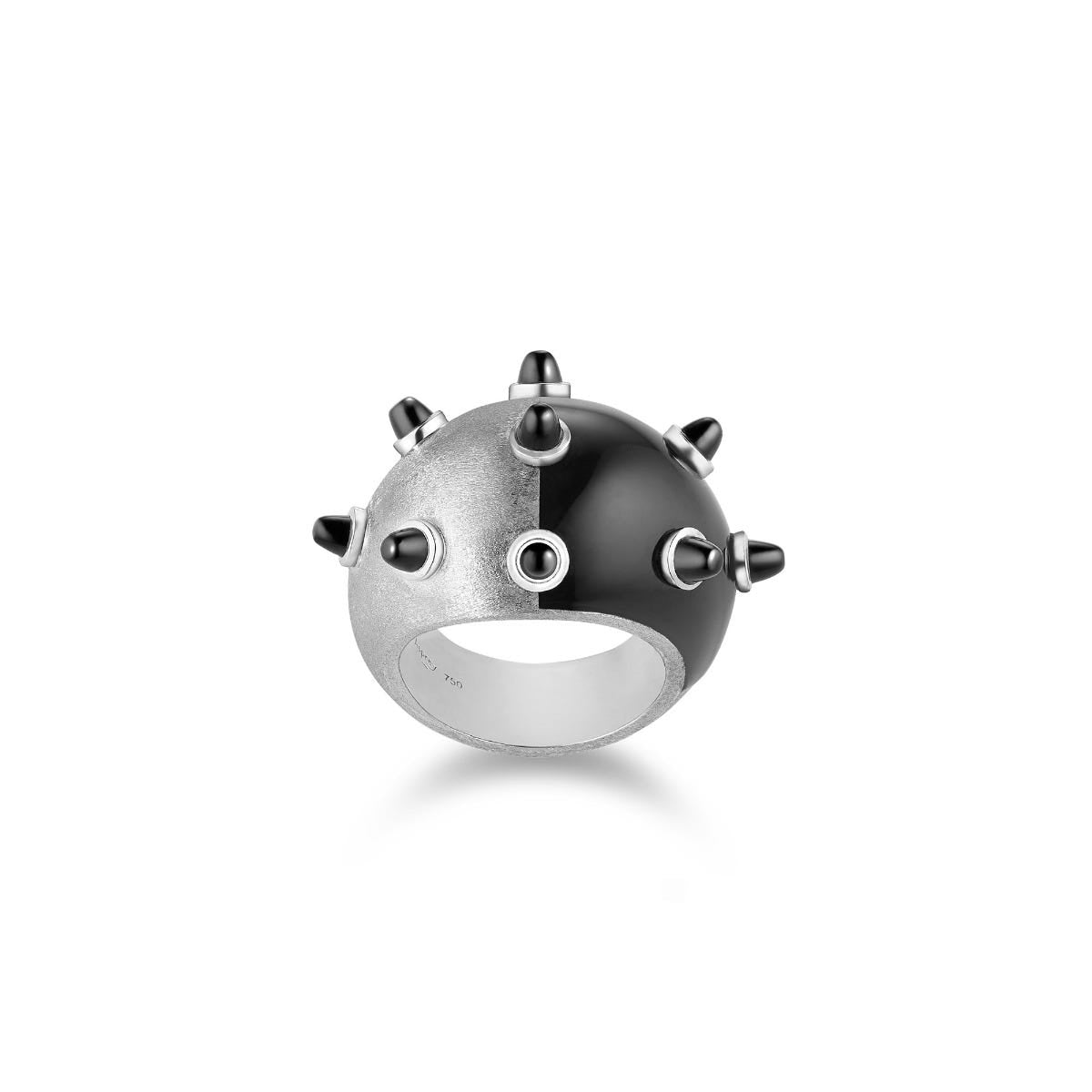 Asprey Cosmic Sputnik Eclipse Ring in 18ct White Gold with Onyx channels inspiration from the atomic age of the 1950s and ’60s to deliver a bold, refined style. Crafted in 18-carat white gold, it features nine onyx stones totalling approximately 1.8 cts, set within the series’ signature star-setting technique.The result: a sculpted, sleek ring that bridges modern sophistication and celestial design.