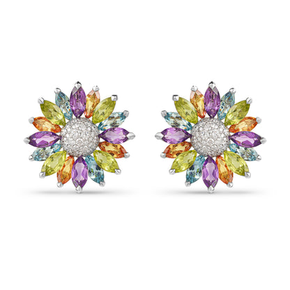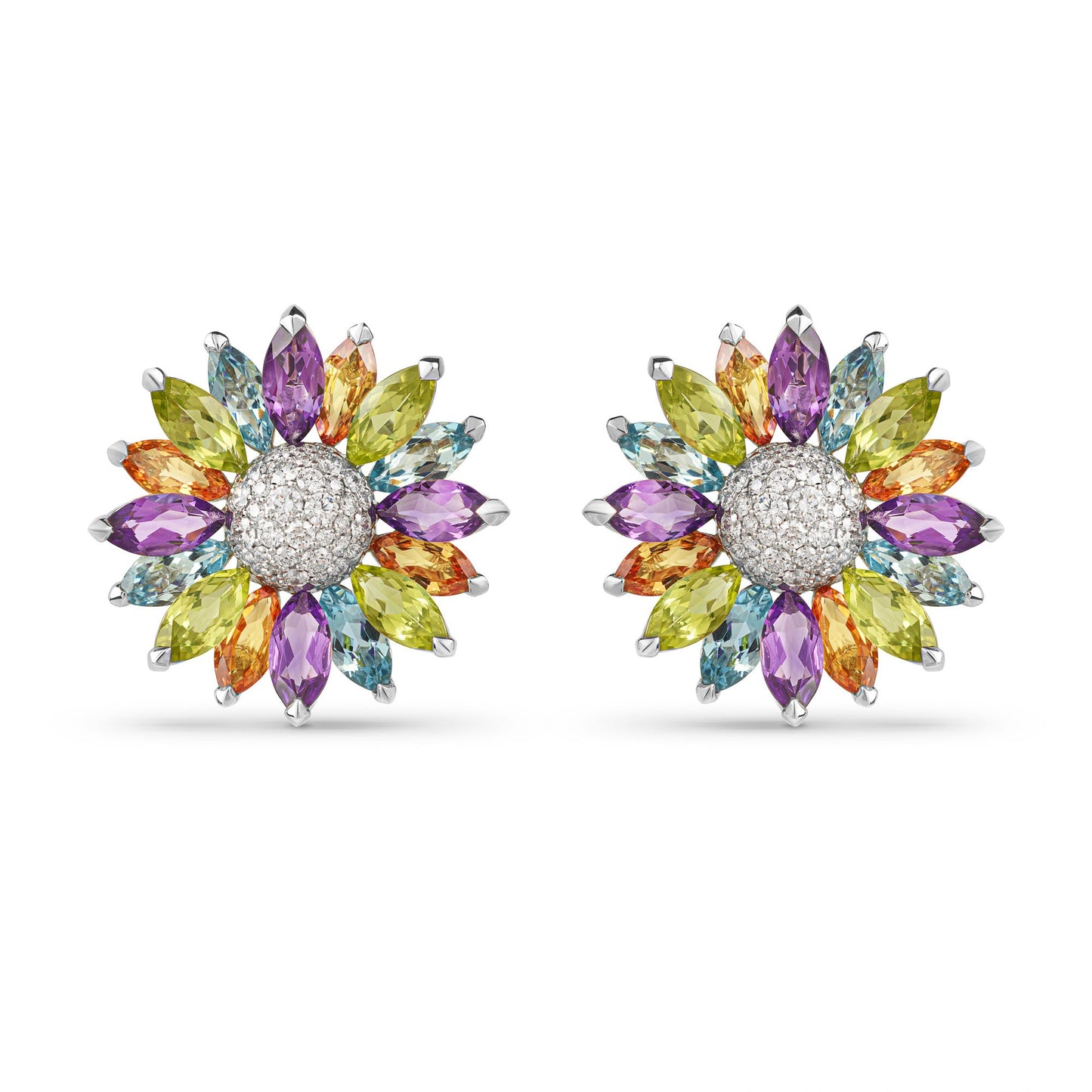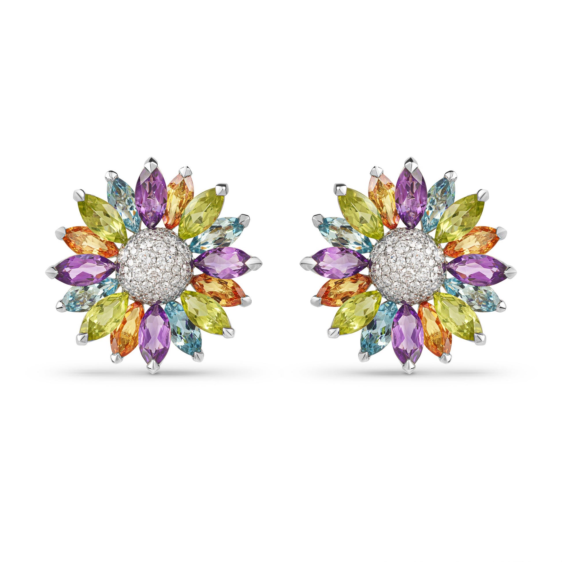 Introducing the stunning Multi Daisy Medium Stud Earrings by Asprey, a true embodiment of elegance and craftsmanship. These exquisite earrings feature 16 marquise-cut gemstones, including enchanting amethysts, aquamarines, peridots, and yellow sapphires, meticulously arranged as vibrant petals in each flower. At the heart of each blossom lies a brilliant-cut diamond centre, intricately set in pavé style, adding a touch of brilliance and sophistication.
