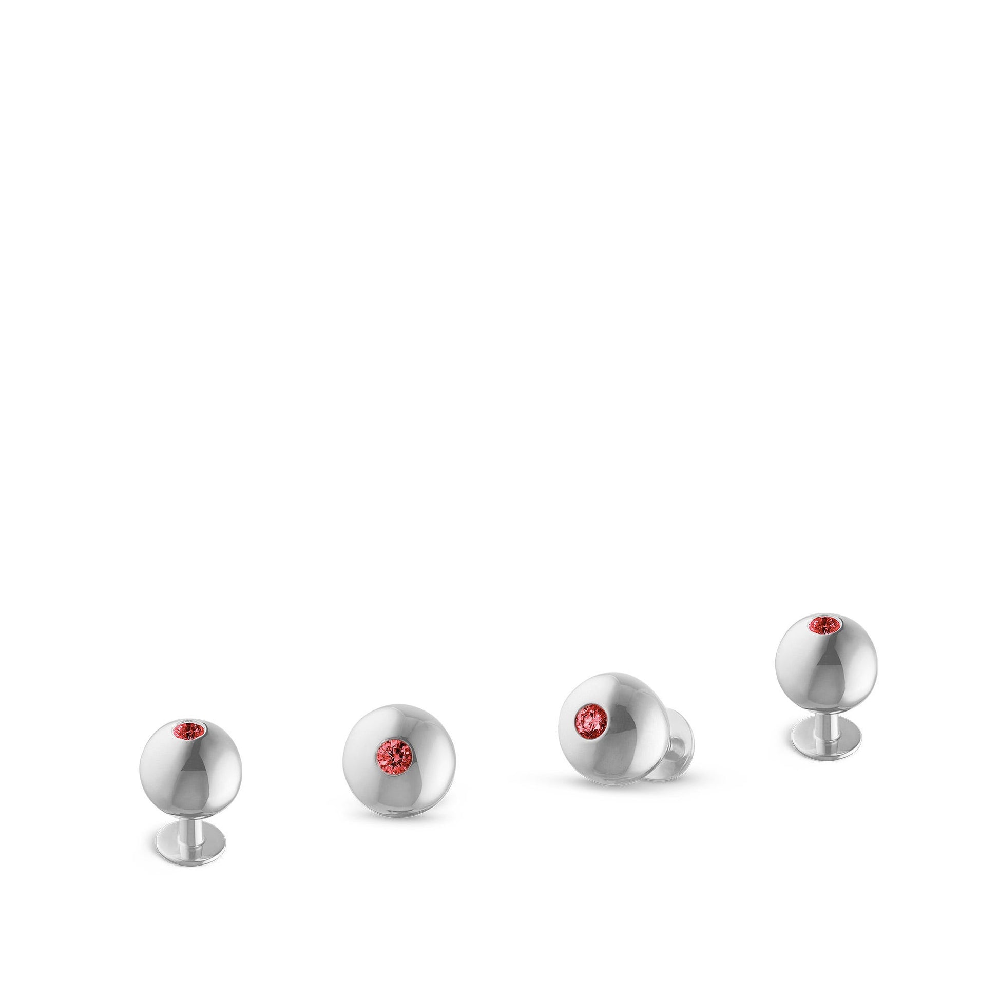 The Asprey Dress Studs in 18 ct White Gold with Ruby are crafted as a set of four in 18 ct white gold, each stud measuring approximately 10 mm in diameter.