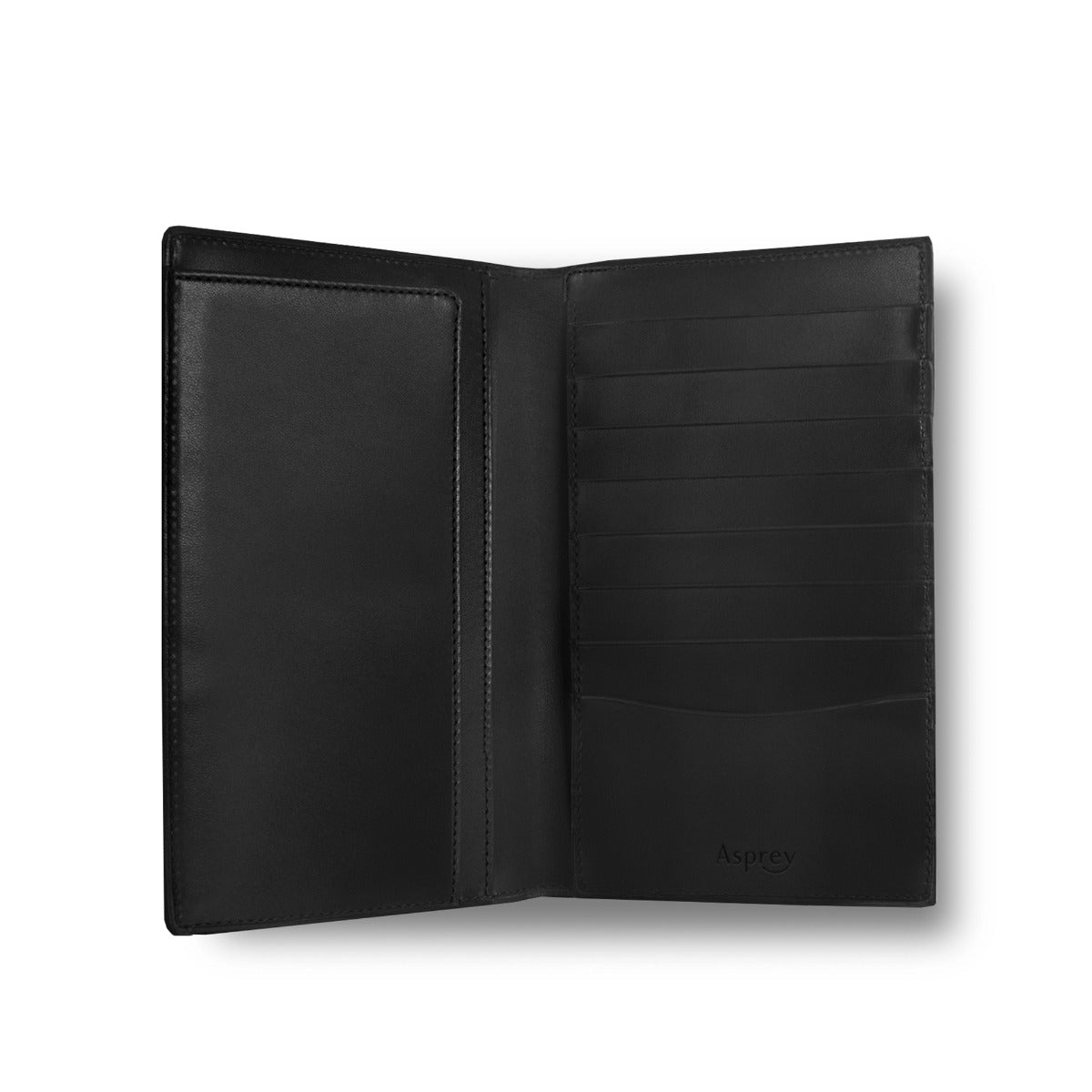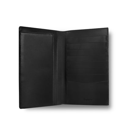 Saddle leather exterior & interior, with silk lining in the pockets. 1 pocket for bank notes, 1 open pocket and 8 credit card pockets. Fine stitching and veined edge detail. Discreet Asprey logo embossed on the interior.