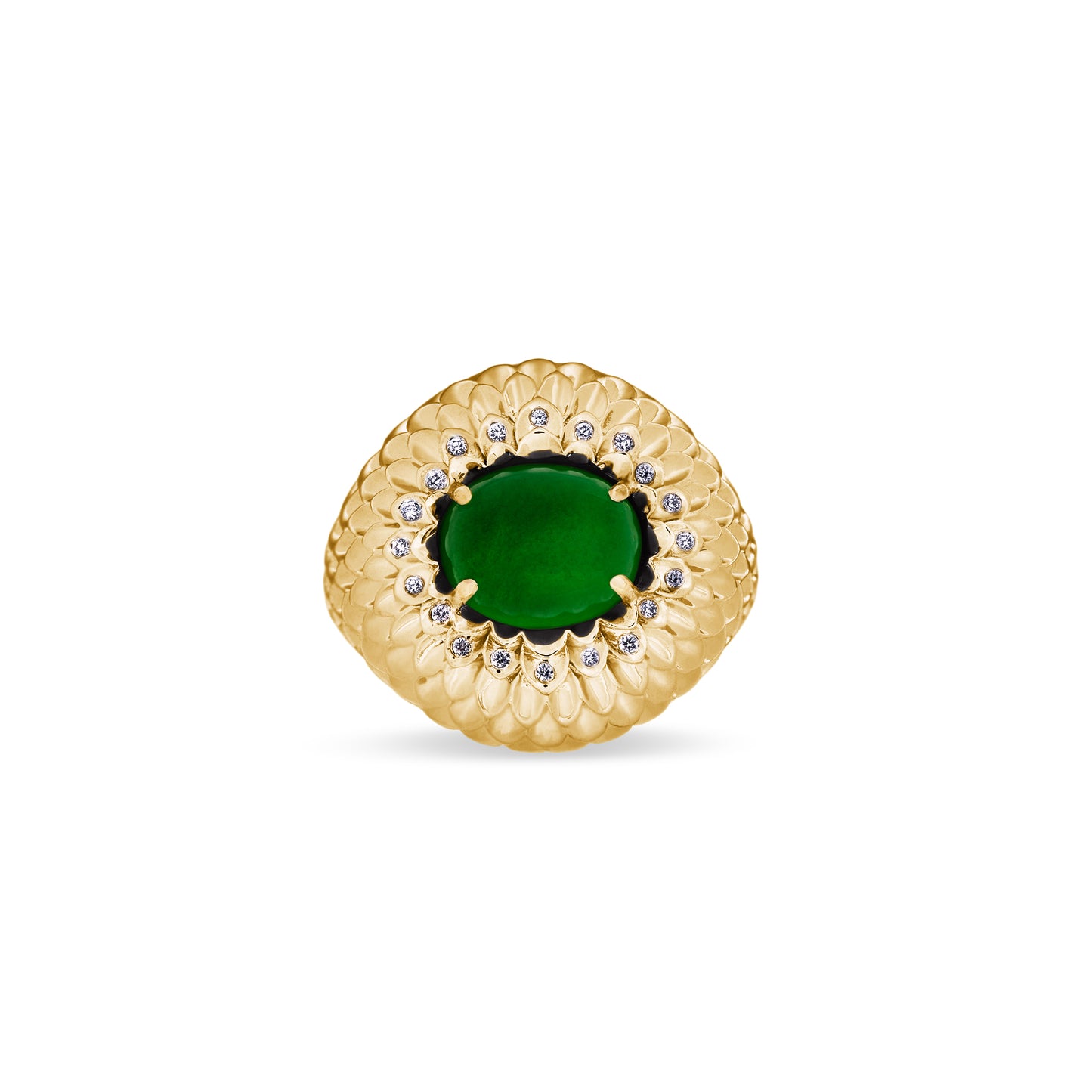 This ring from the Dahlia collection features a finely carved Imperial Jadeite centre, framed by petal-like forms in 18ct yellow gold. Brilliant-cut diamonds are set into the design, providing delicate contrast and accentuating the jadeite’s vibrant green hue. Inspired by the elegance of the dahlia flower, the ring blends organic form with refined detailing, exemplifying Asprey’s tradition of botanical-inspired fine jewellery and meticulous craftsmanship.