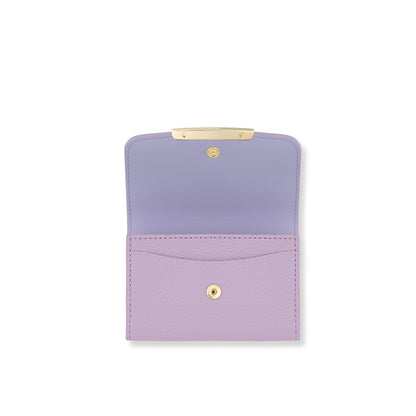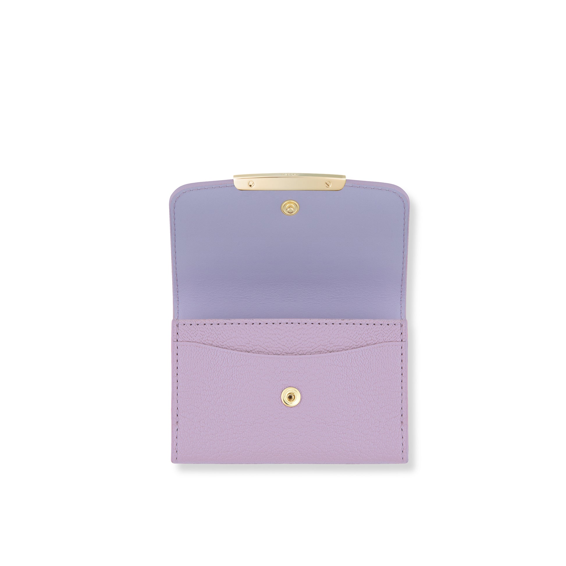 Inside, the card holder features two slip pockets on each side, ideal for organising up to four cards, and a centre open-top edge pocket designed to accommodate additional cards or bank notes. The interior is lined in Nappa leather and silk-lined pockets, and the exterior is finished with a subtle Asprey signature button in a pale gold finish.