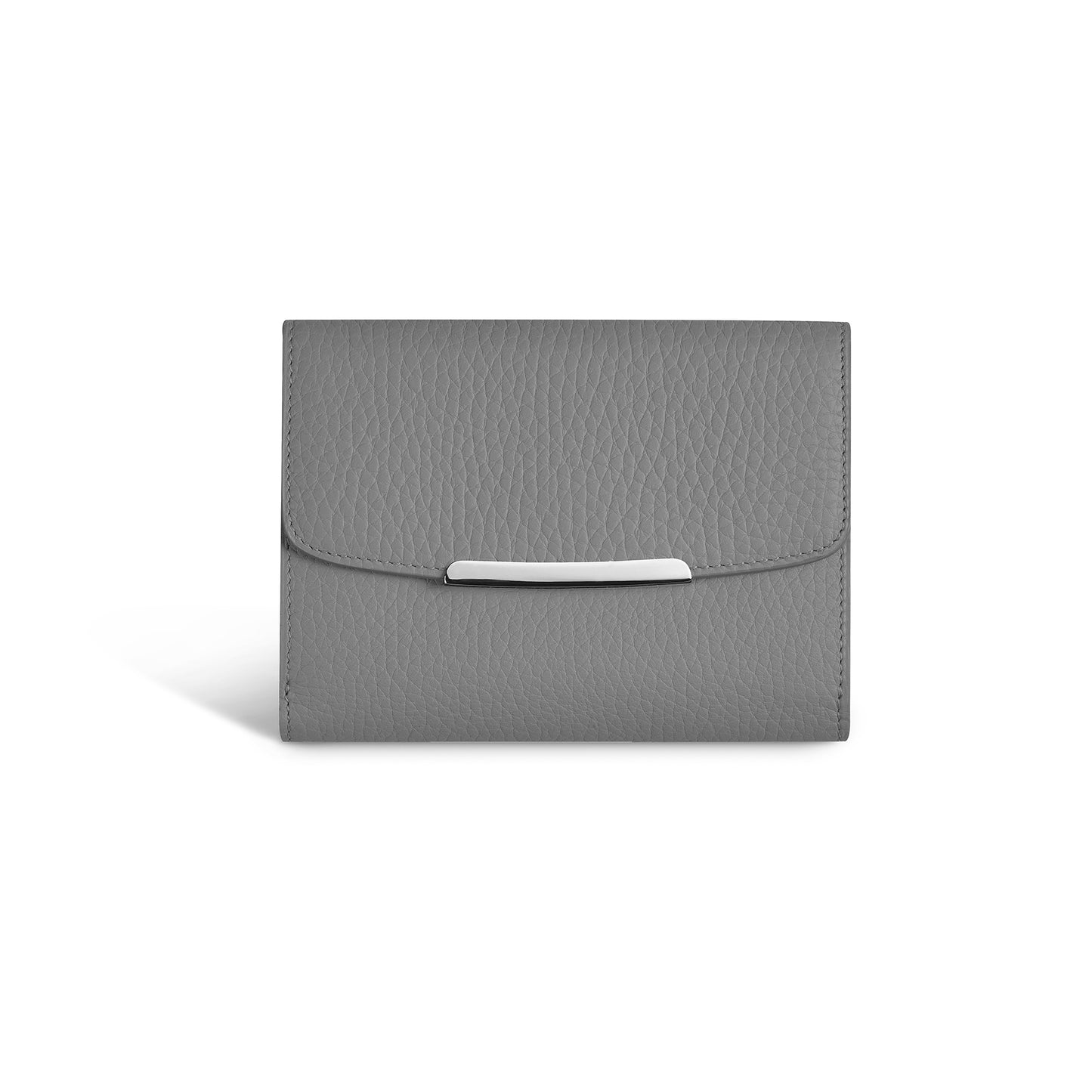 The envelope-style Regent French Purse in Silver Grey soft-grain leather is accented with a polished palladium-finish metal bar along the flap edge. Handcrafted in supple European leather, the design features a matching leather interior, a front coin section with press-button closure, and a rear panel with six credit-card pockets, one bank-note pocket, and two additional slip pockets. The compact silhouette closes with a slim tab and press-button, offering an elegant balance of form and function.