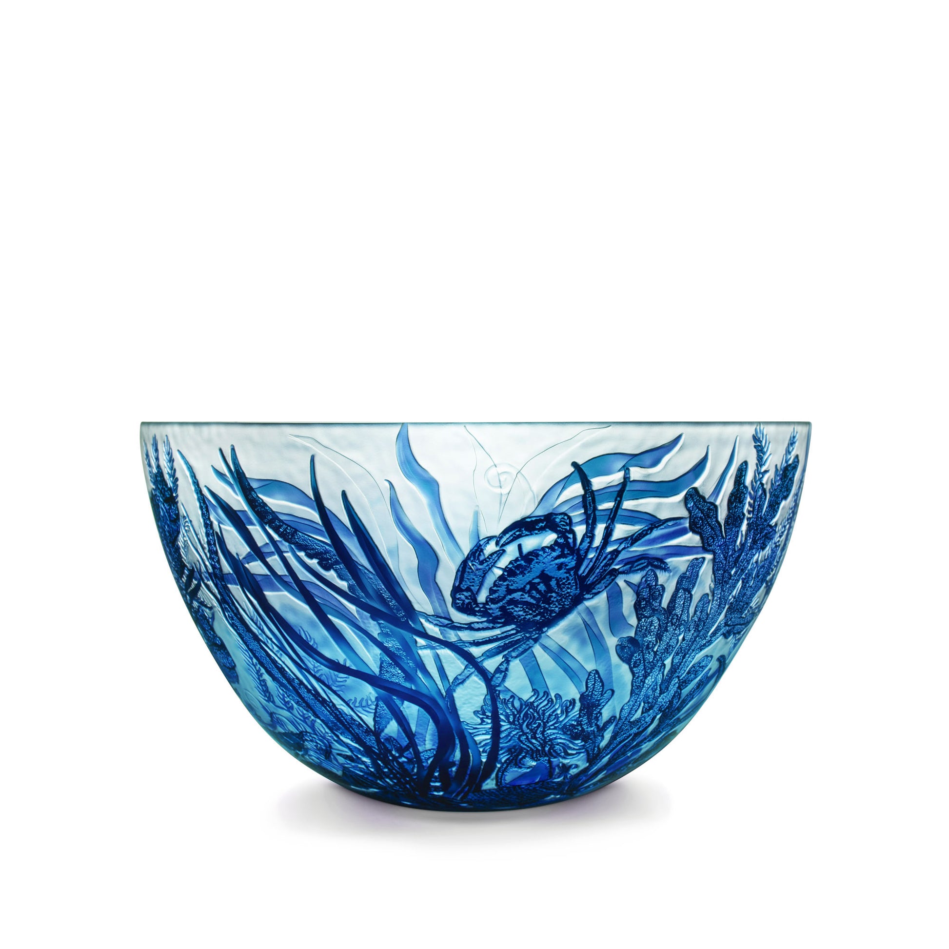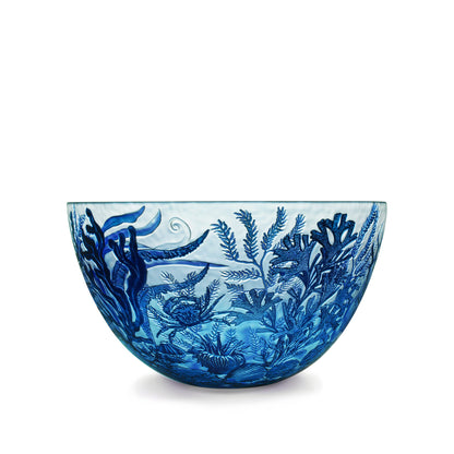 An exclusive collaboration between Asprey and Jonathan Harris, the renowned British contemporary glass artist. This lead-free glass bowl is hand-carved with minute details, featuring the distinctive plant life and sea creatures of the English coastal waters and rockpools. The intricate decoration is achieved by using diamond point drills and contemporary carving techniques, creating a tactile cameo in fine detail and relief. Each bowl is mouth blown then layered with several enamel colours on the inside, which is then carved through to give the cameo relief effect.