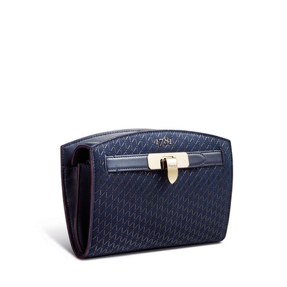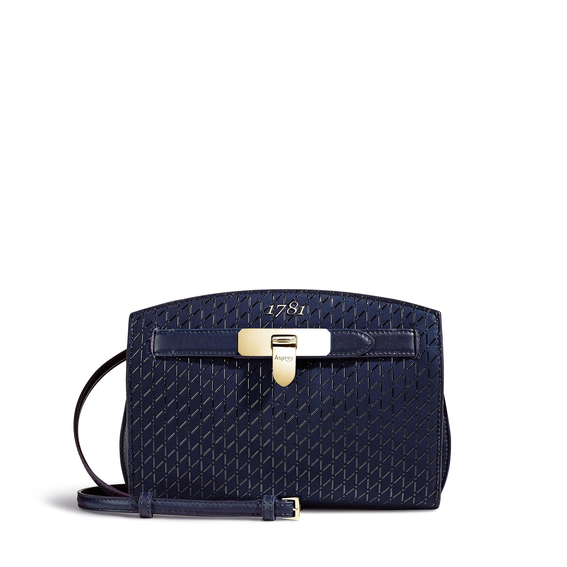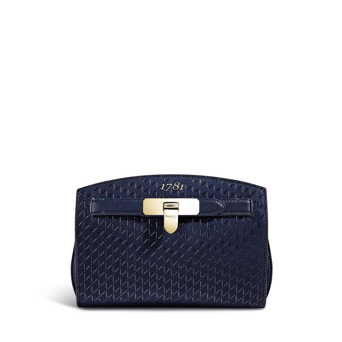This 1781 Pochette is crafted from sleek, chic crosshatch leather in black lacquer on blueberry soft leather. The 1781 collection of handbags is designed to celebrate the establishment of Asprey in that year and the styling harks back to early travel bags. Wear the endlessly versatile 1781 pochette with the belt strap elegantly closed or open for a more informal look. Hold in the hand or wear cross body on the detachable shoulder strap closure.