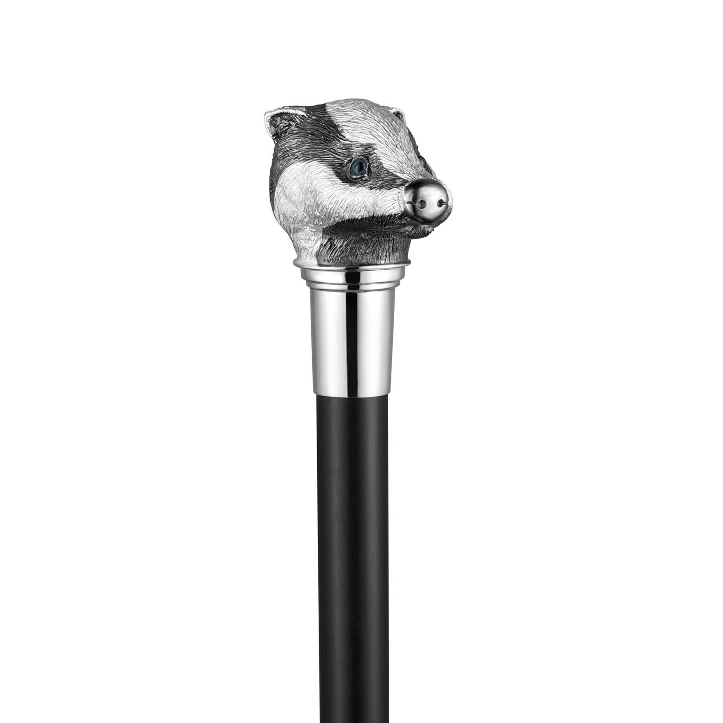 This Asprey Walking Cane features a sterling silver collar and a cast badger's head with captivating glass eyes. The ebony wood, with its deep, luxurious hue, adds a touch of classic sophistication to the Asprey Walking Cane. This refined accessory not only showcases Asprey's commitment to quality but also serves as a practical and stylish addition to your ensemble.