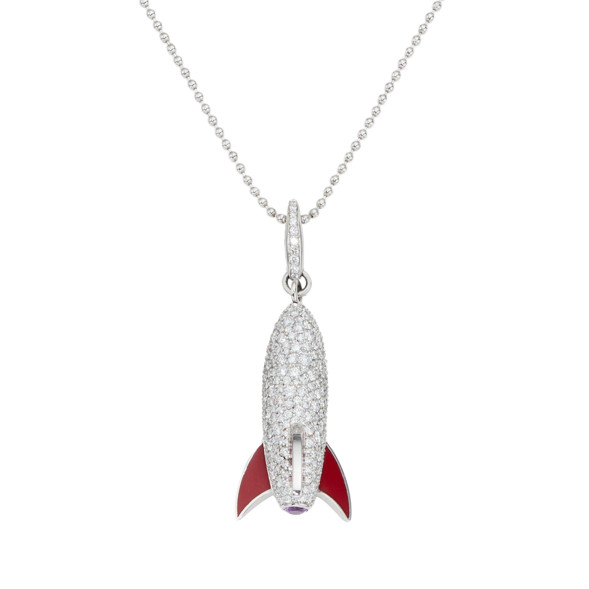 The Cosmic Rocket Necklace captures the bold imagination of the skies, crafted in sleek 18ct white gold and illuminated with exceptional brilliance. From the Cosmic collection, this playful yet luxurious rocket pendant is set with 2.44cts of dazzling diamonds across its sculpted body, complemented by vibrant red enamel fins that add a striking burst of colour. A delicate 0.13ct sapphire sits at the base, subtly echoing the glow of a rocket’s trail. Suspended from a 32-inch chain, it offers a dramatic, contemporary silhouette. Wear it as a statement necklace or attach the rocket pendant to your favourite charm bracelet for a uniquely personalised celestial look.