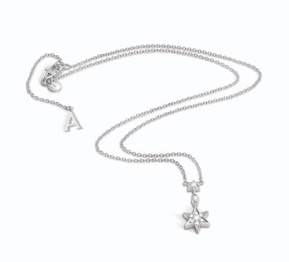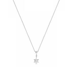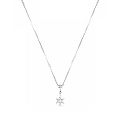 At the heart of this enchanting pendant are two resplendent pavé diamond stars, their brilliance rivalling the twinkle of distant galaxies. These stars, intricately linked in 18ct white gold, symbolise the eternal dance of the cosmos, a mesmerising display of unity and beauty that transcends time and space.