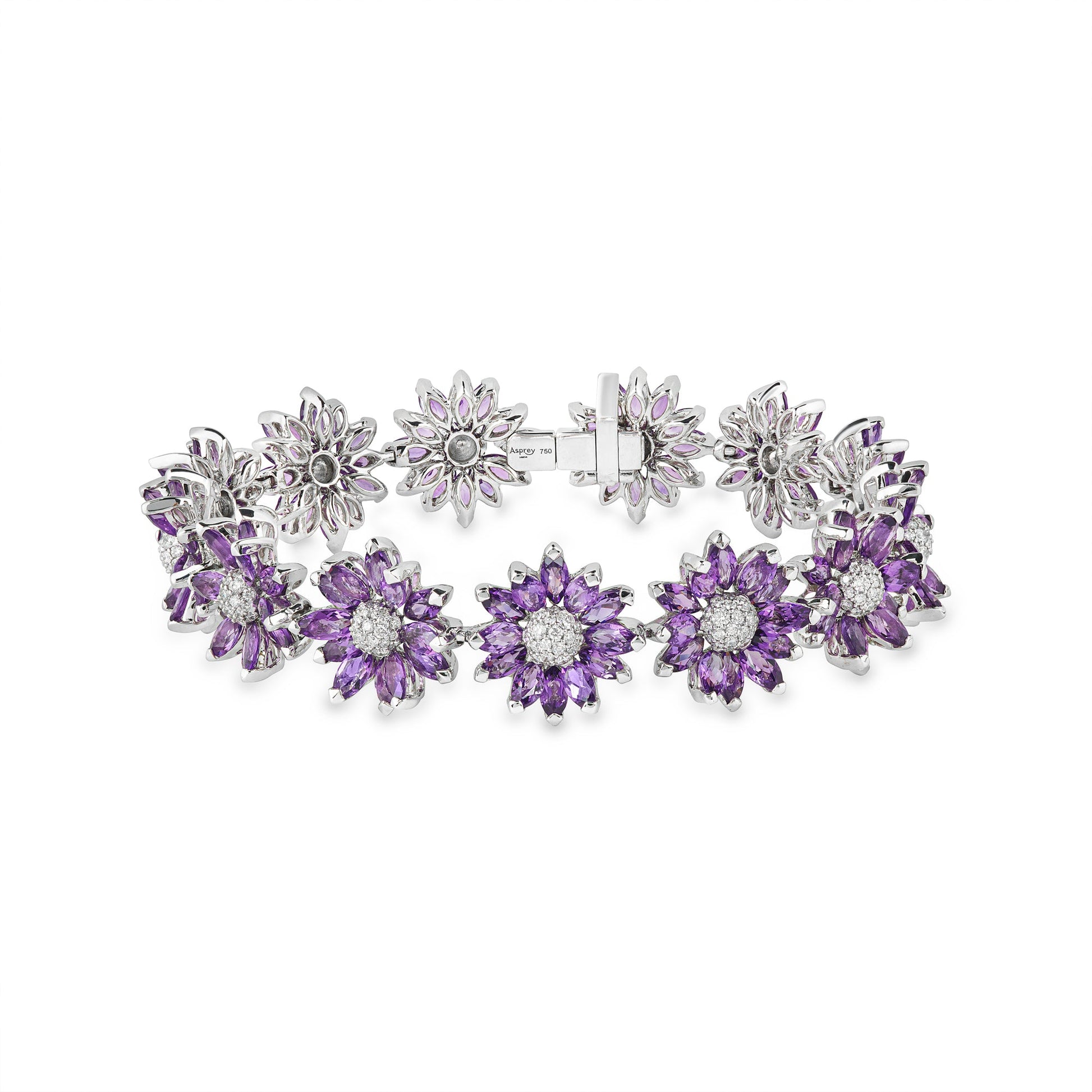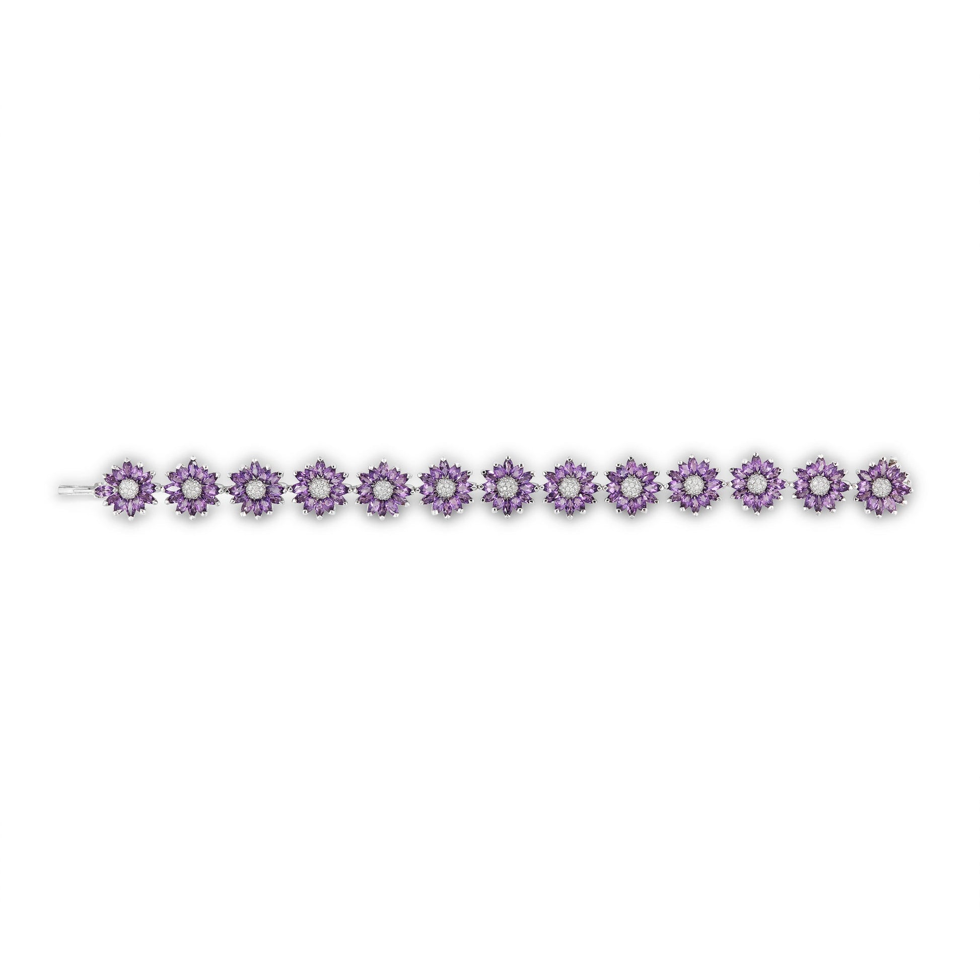 Daisy Bracelet in 18ct White Gold with Amethyst and Diamonds by Asprey, features a row of daisy flowers delicately arranged to create a daisy chain. Each flower showcases marquise-cut amethysts petals. The centre of each flower glistens with brilliant-cut pavé diamonds, adding a touch of brilliance and sophistication. The meticulous craftsmanship is evident in the precision of the perfectly formed V-shaped claws, securely holding each stone in place and positioned at alternating levels to maximize light reflection and create a dazzling sparkle. The flow of the design is seamlessly maintained by a concealed clasp, ensuring a continuous and elegant aesthetic.