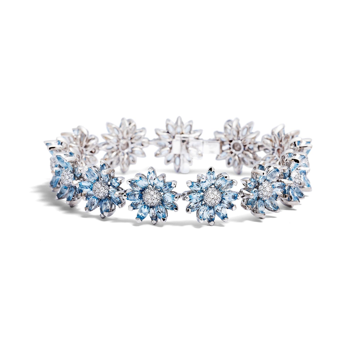 This exquisite bracelet, handcrafted in 18ct white gold by Asprey, features a row of daisy flowers delicately arranged to create a daisy chain. Each flower showcases marquise-cut aquamarine petals, emanating a serene blue hue. The centre of each flower glistens with brilliant-cut pavé diamonds, adding a touch of brilliance and sophistication. The meticulous craftsmanship is evident in the precision of the perfectly formed V-shaped claws, securely holding each aquamarine in place and positioned at alternating levels to maximize light reflection and create a dazzling sparkle. The flow of the design is seamlessly maintained by a concealed clasp, ensuring a continuous and elegant aesthetic.