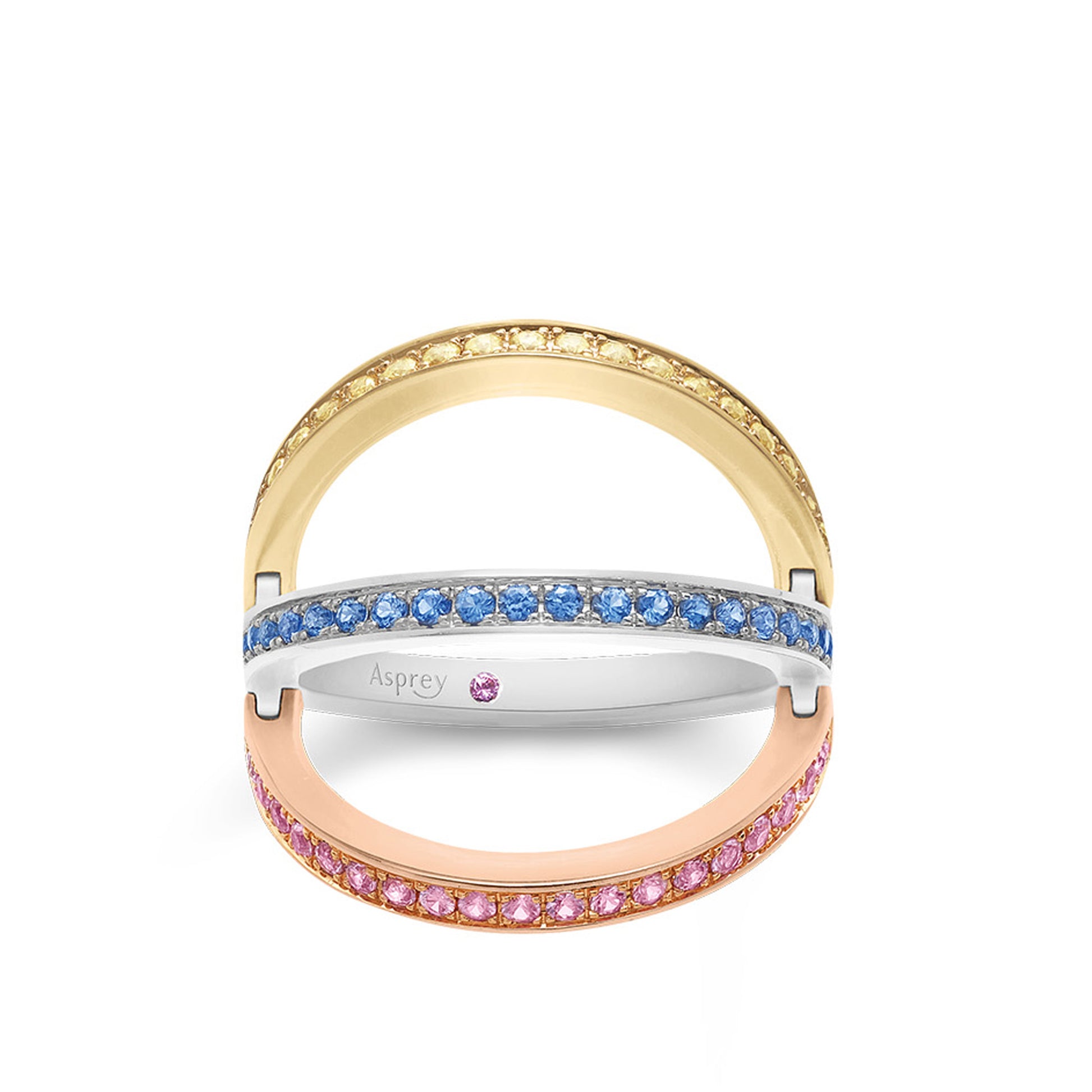 Yellow, blue and pink sapphires are set across yellow, white and rose gold, highlighting distinct colors in elegant sequence. Each side offers a unique look within one striking ring.