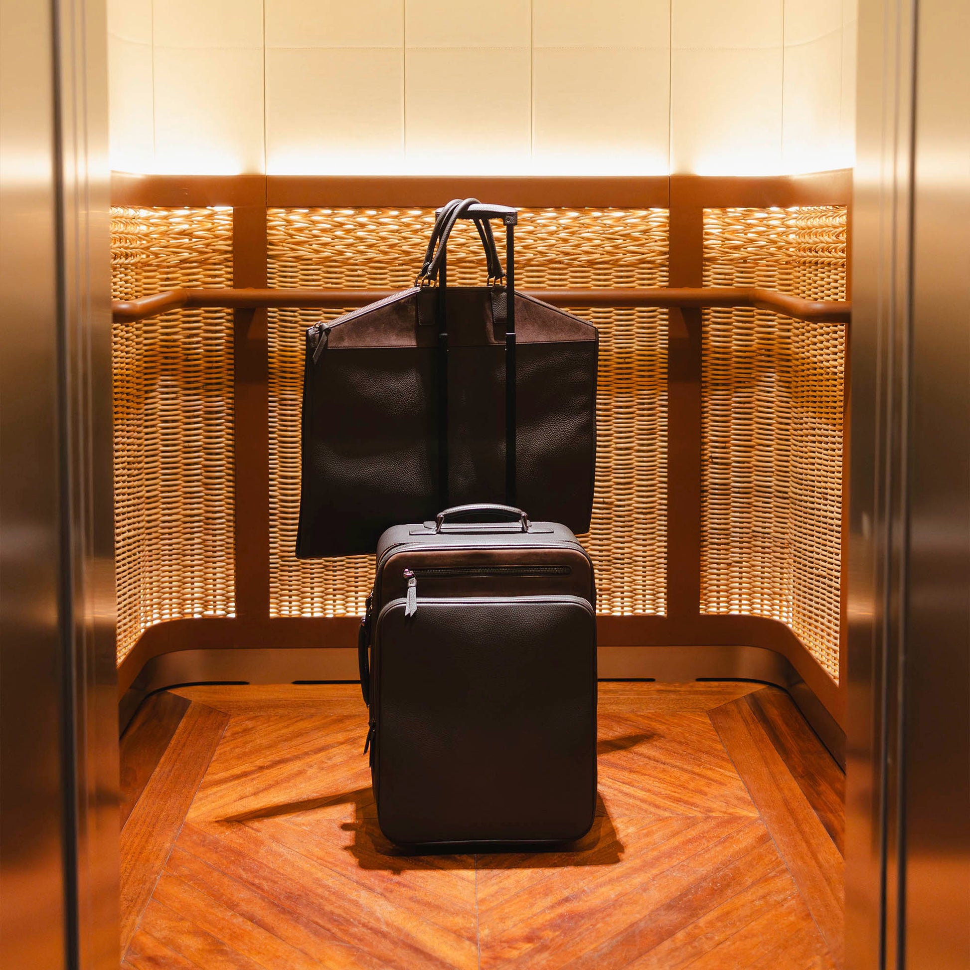 The GMT suit bag is masterfully constructed using soft grain leather and nubuck, ensuring a supple and luxurious feel. Its elegant carbon color has a timeless charm, elevating your travel experience.