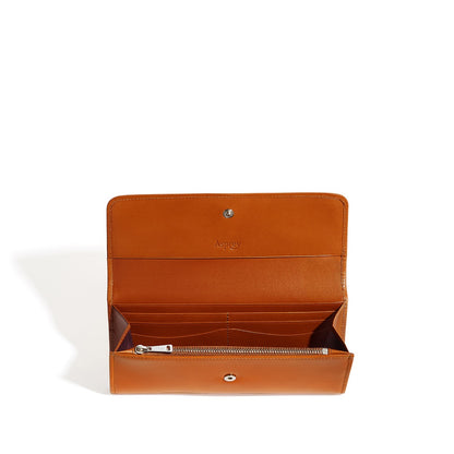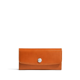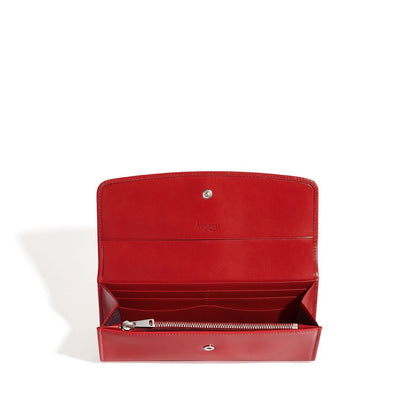 The Grafton Continental Purse in Red Saddle leather offers a refined slim profile crafted for daily elegance and organisational ease. The exterior and interior are both premium saddle-tanned calf leather with Nappa and nylon linings. The layout delivers six credit card slots, a full-length bank-note pocket, and a zip coin compartment. A discreet press-button closure lies beneath the front flap, maintaining the clean silhouette.