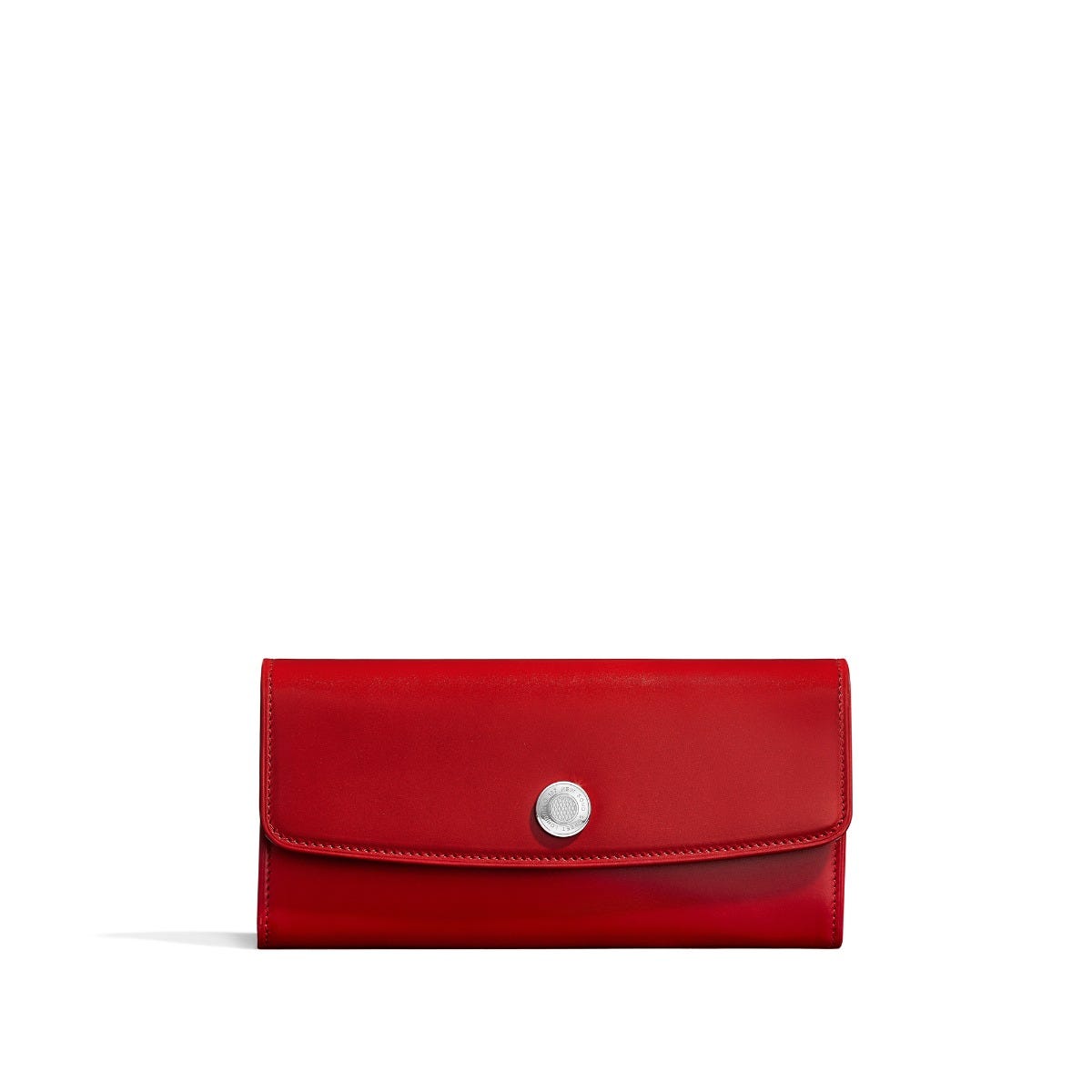 The Grafton Continental Purse in Red Saddle leather offers a refined slim profile crafted for daily elegance and organisational ease. The exterior and interior are both premium saddle-tanned calf leather with Nappa and nylon linings. The layout delivers six credit card slots, a full-length bank-note pocket, and a zip coin compartment. A discreet press-button closure lies beneath the front flap, maintaining the clean silhouette.