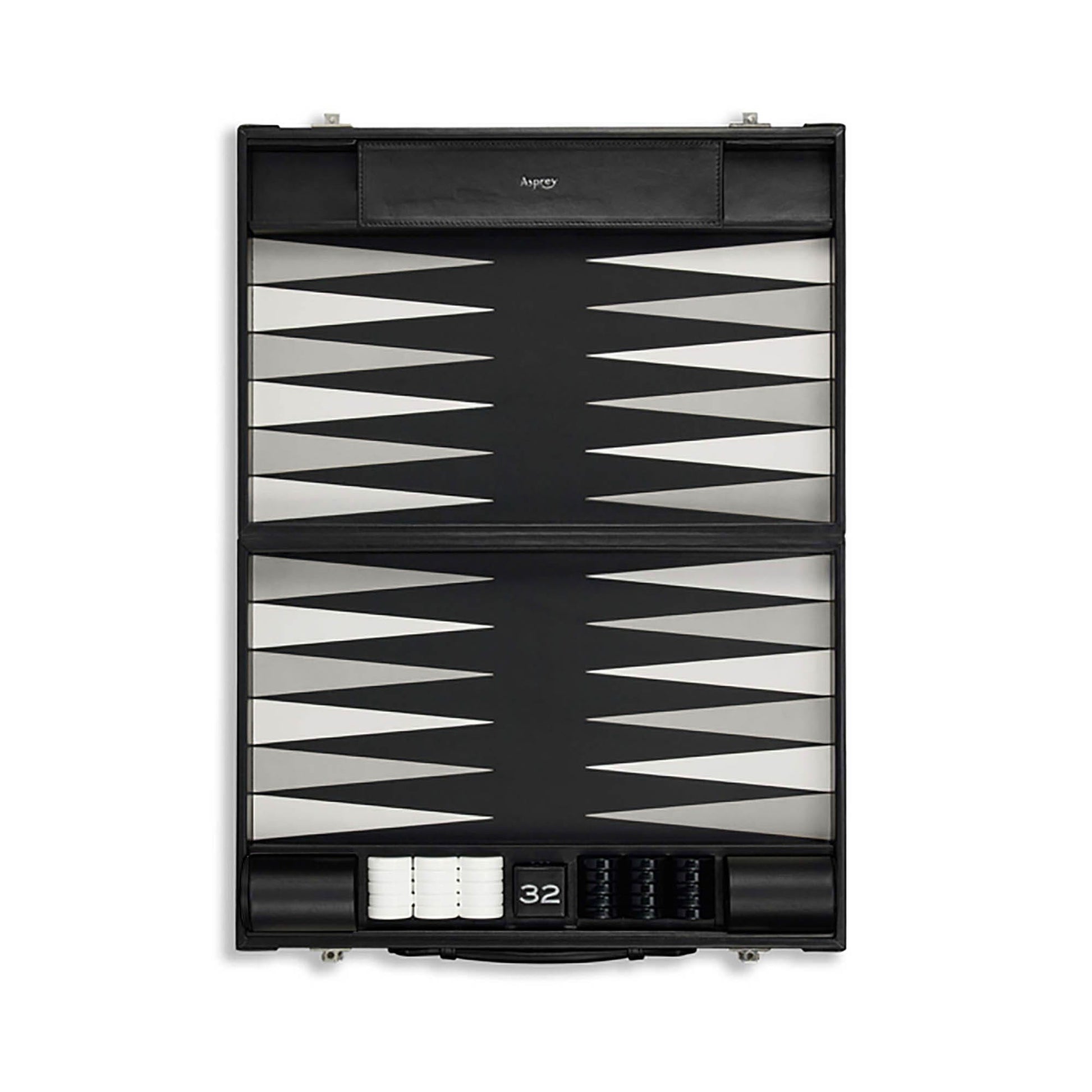 The Hanover Backgammon Set is a carefully considered combination of materials - selected to suit all levels of play, from the professional player to the recreational and new player. The exterior case of saddle leather features defining stitch lines and burnished edges. The smooth lambskin of the playing field is specially selected for speed of play, and the points are cut and inlaid with finesse. The ball-cornered - to roll across the leather - dice are casino quality precision dice. Resin stones (or counters) will move quickly across the playing field, and when not in play are stored in leather lined compartments alongside the leather dice cups and the doubling cube. The case closes with palladium finish key locks. The Hanover Backgammon, available in three sizes, will adorn your home or make a memorable gift.