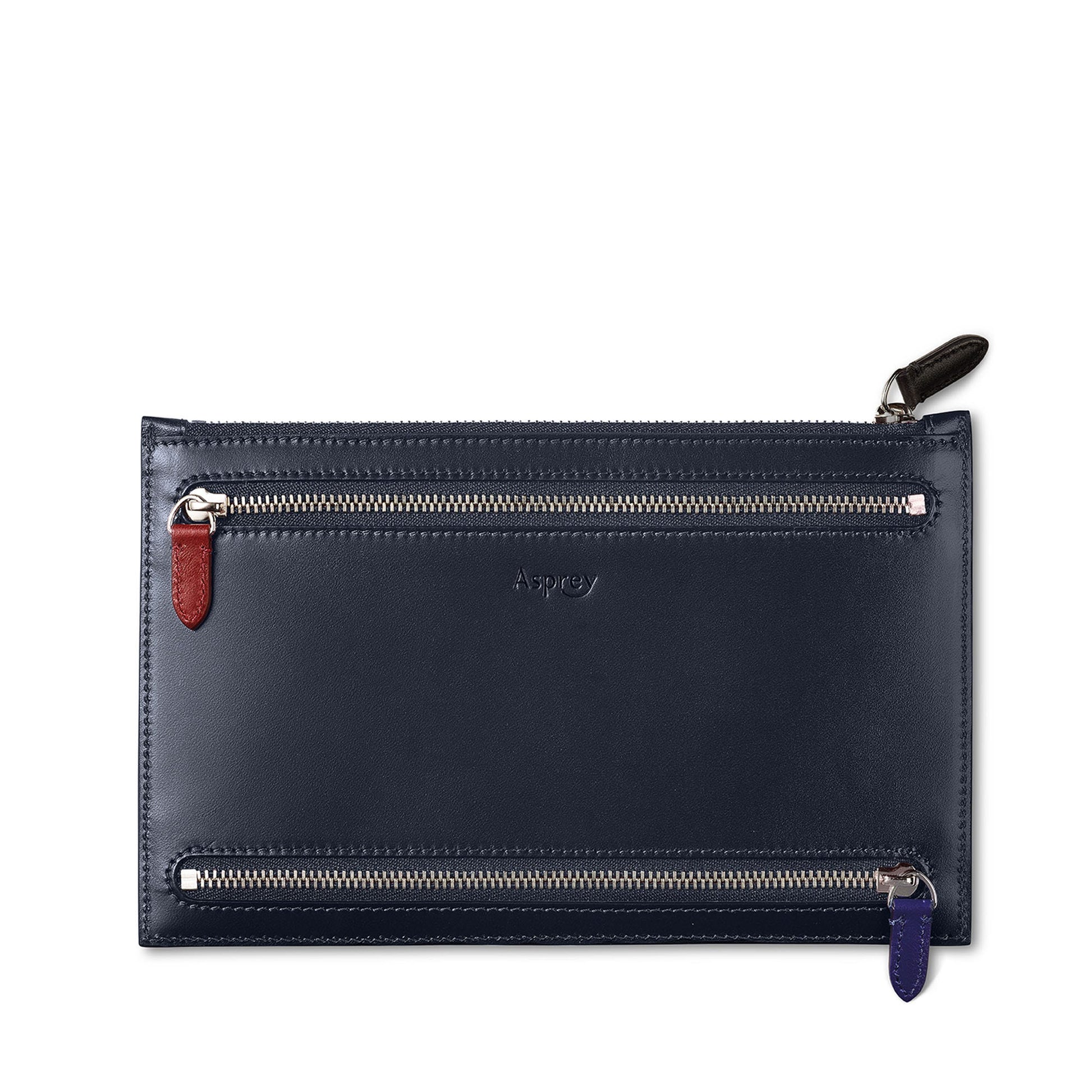 Saddle leather with silk pocket interiors. Polished palladium zips, lambskin zip tags, fine stitching and veined edge detail. Discreet Asprey embossed logo.