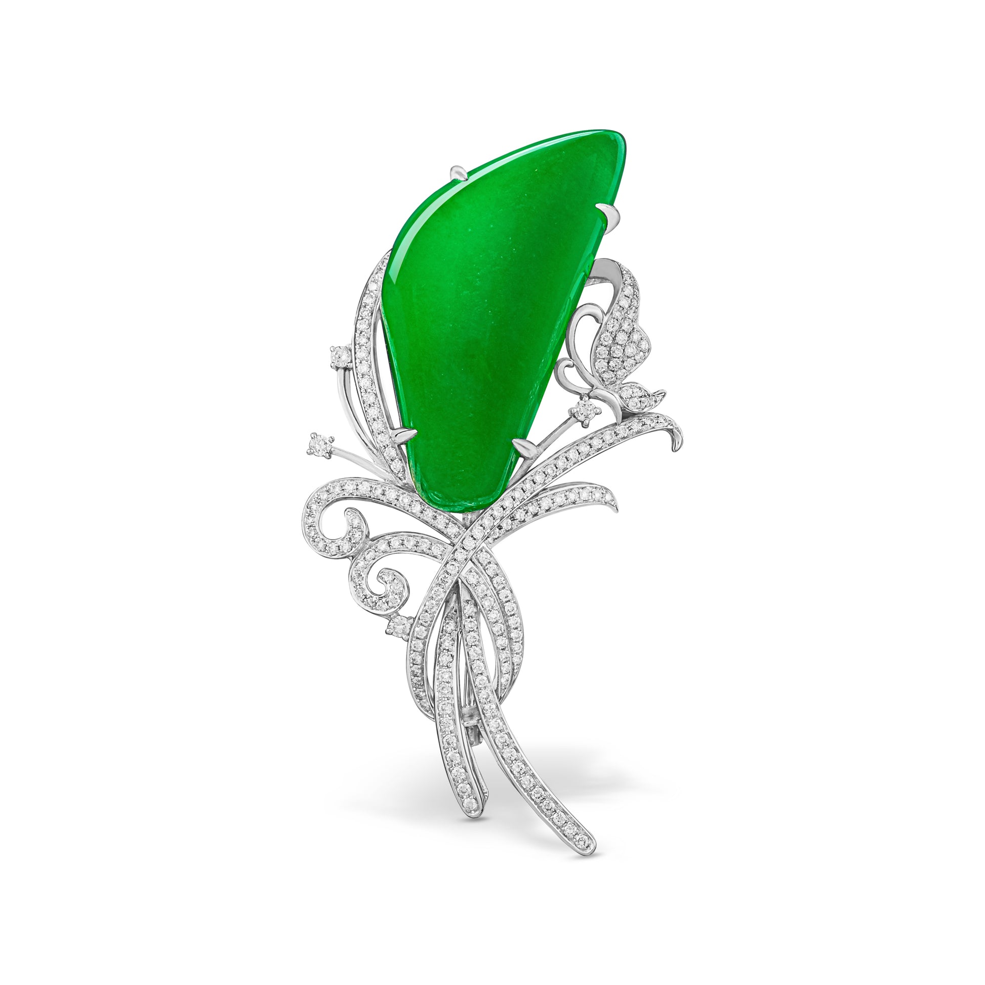This exquisite brooch features a vivid Imperial Jadeite cabochon distinguished by its intense green colour and natural luminosity. Set in 18ct white gold, the 167.5ct Imperial Jadeite is accented by white diamonds that trace elegant, flowing lines around the central stone of . The design reflects Asprey’s enduring commitment to exceptional gemstone selection and the artistry of fine jewellery craftsmanship.