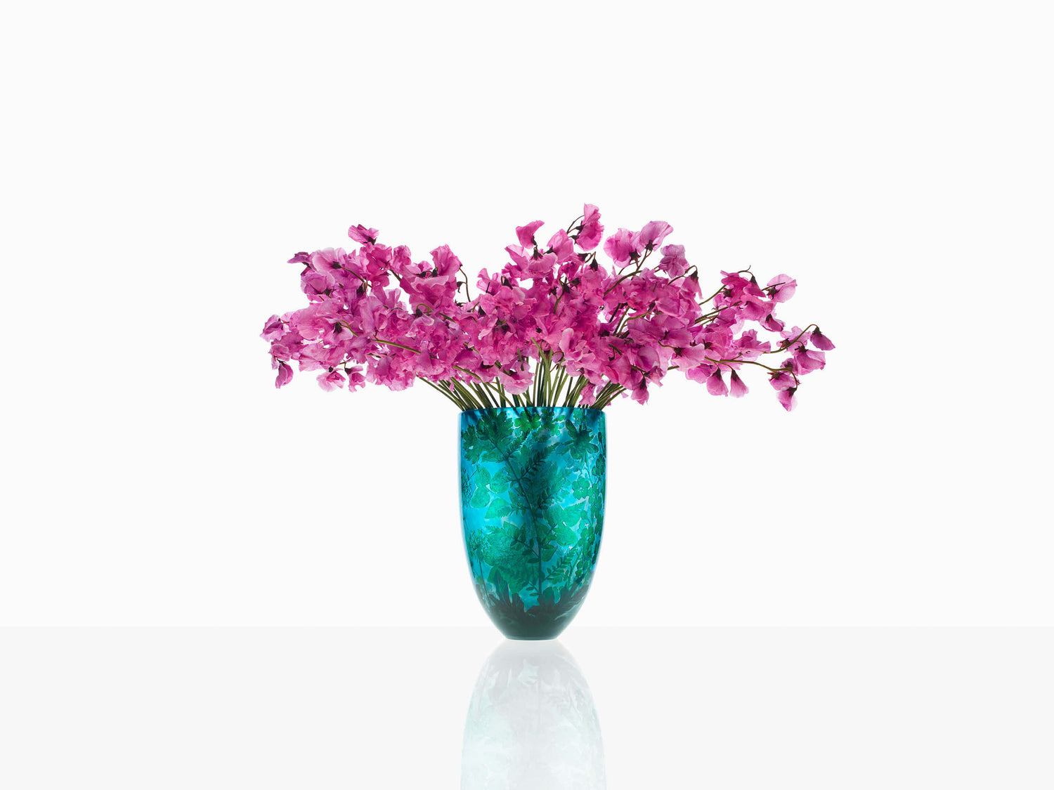 Mouth blown and built up in layers of rich transparent glass colours, the vase boasts multiple strata of pure colour, creating a blank canvas for the carving work. The interior surface is then intricately carved through the coloured layers, resulting in a captivating cameo relief effect. Each piece in the collection is truly one-of-a-kind, taking an impressive 35 to 40 hours to produce.
