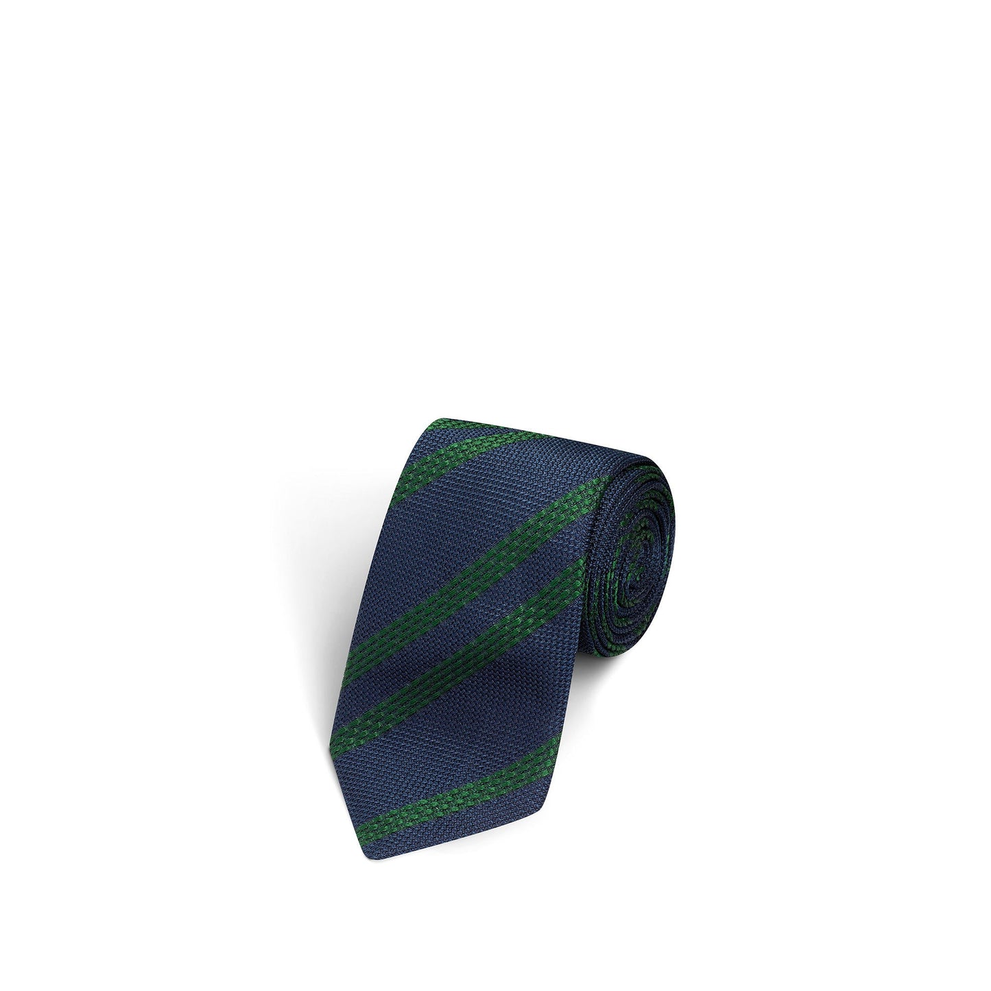 Elevate your style with this exceptional Large Stripe Silk Tie, meticulously crafted to the highest standards of luxury. Its captivating navy hue is adorned with striking green stripes, adding a touch of elegance to any ensemble.