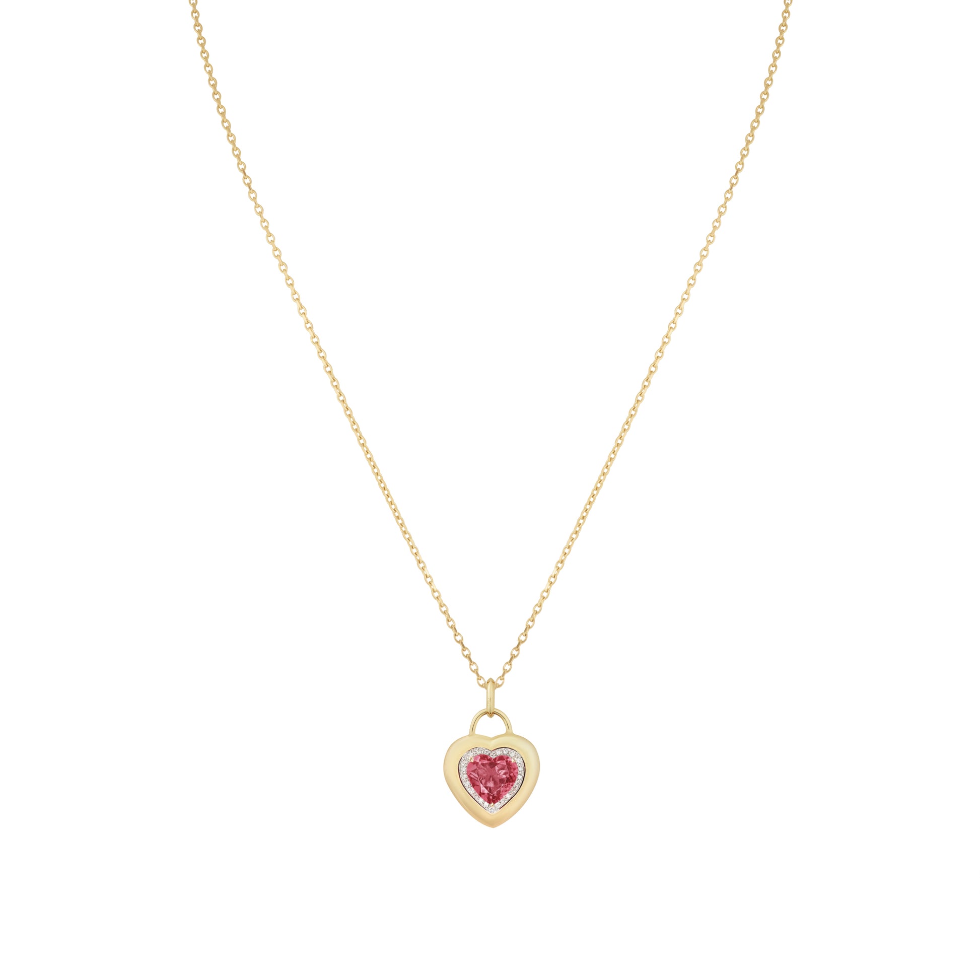 Crafted in hallmarked 18ct yellow gold, this heart-shaped padlock pendant features a rich 1.8 ct rubellite gemstone framed by shimmering diamonds. The 1.6 cm (width) by 2 cm (height) pendant hangs on a 23 cm chain and fastens with an ‘A’ clasp.