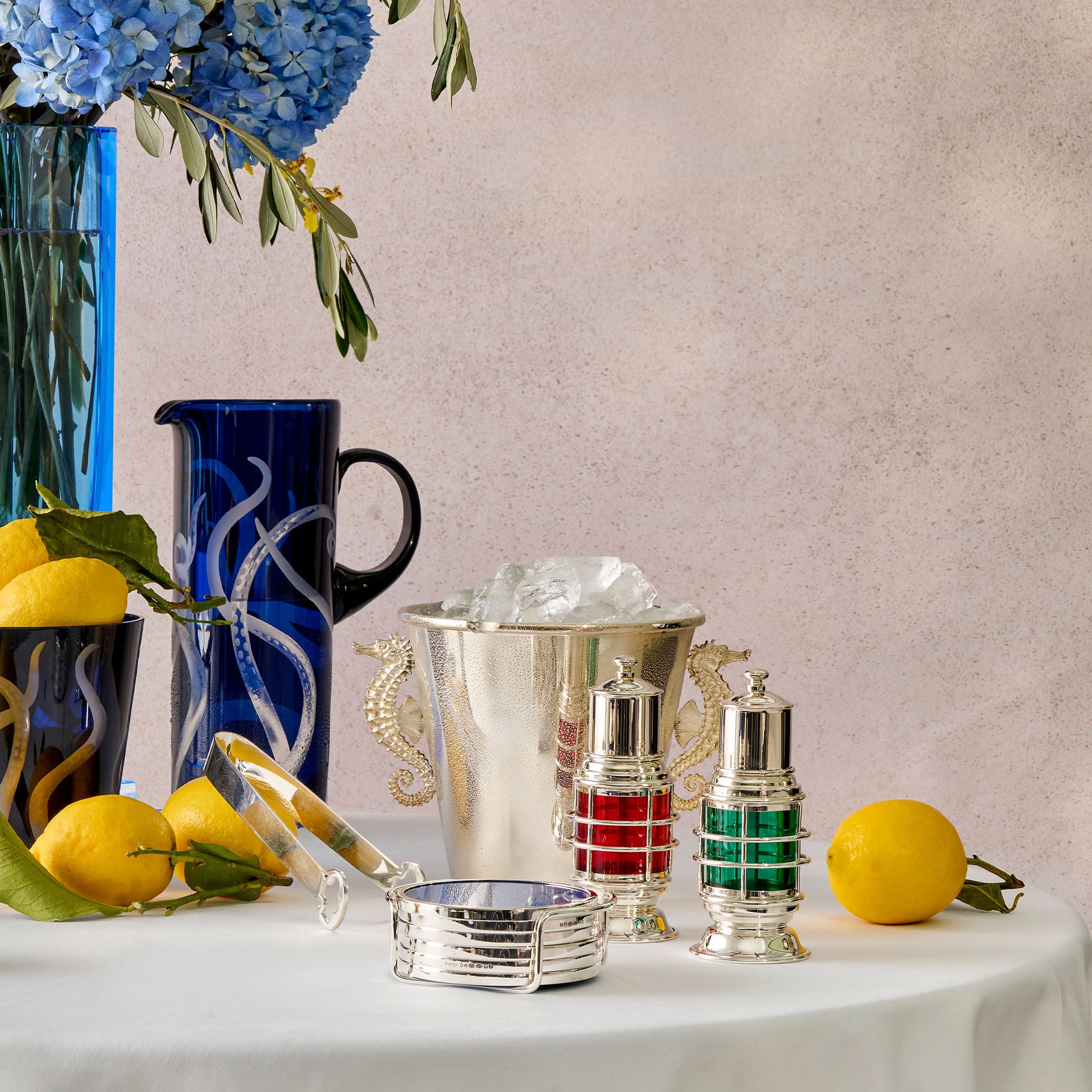 These nautical salt and pepper mills are made by hand in Asprey London workshops, from colored glass with a sterling silver frame. They refer to the left (port) and right (starboard) sides of a ship and are colored appropriately. The (red) salt grinder is gilded inside to prevent corrosion.