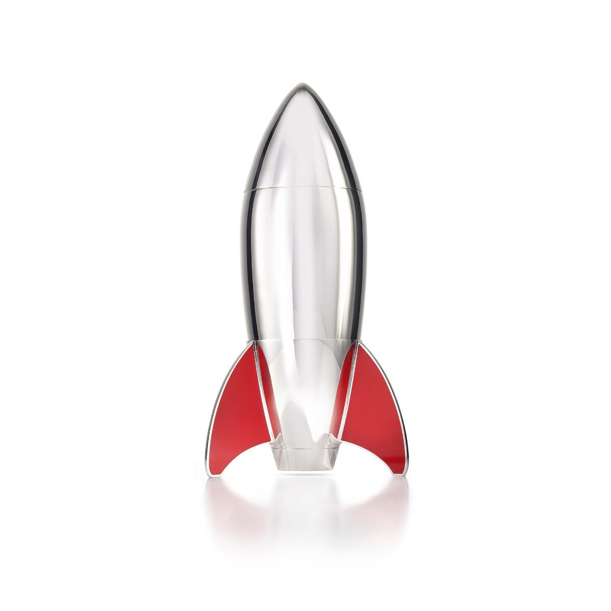 Designed for the discerning connoisseur, the shaker's bayonet fitting lid ensures a secure seal. The removable lid, inner cap, and strainer facilitate effortless cocktail creation – just insert ice and your chosen cocktail ingredients, and shake to perfection. Its sleek modern rocket-shaped design fits into a supporting base with distinctive red enamelled fins.