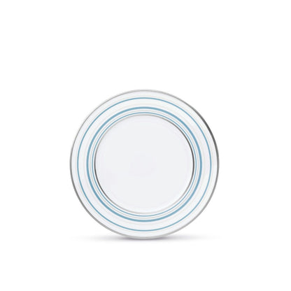 With its metallic blue and platinum ring pattern, the Saturn dinnerware collection is a clean design adaptable to either contemporary or classic dining room settings. Pieces feature a hand-finished platinum edge.