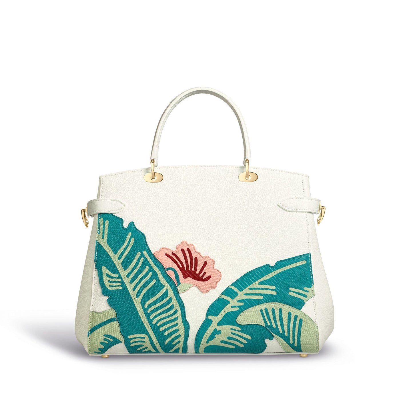 Expertly crafted from soft grain leather, the Taylor handbag features a striking lizard banana leaf decoration. The white colour of the bag exudes sophistication, while the chilli and rose petal palladium finish accessories lend a subtle yet eye catching contrast.