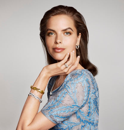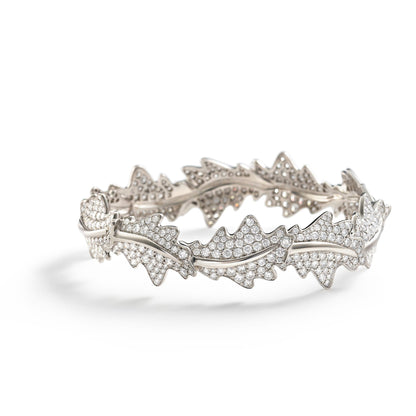 This exquisite Oak Leaf bangle is hand-inlaid with 10.30ct of pavé-set diamonds to blend seamlessly with the precious metal, reflecting an ethereal sparkle at every angle. Cast from polished 18ct white gold, it features curved leaves lifted from the majestic oak tree—a symbol of wisdom, strength and enduring beauty. It’s finished with a discreet clasp to ensure the design flows beautifully. Wear it solo as a statement piece or complement it with matching jewellery from the Asprey Woodland collection.