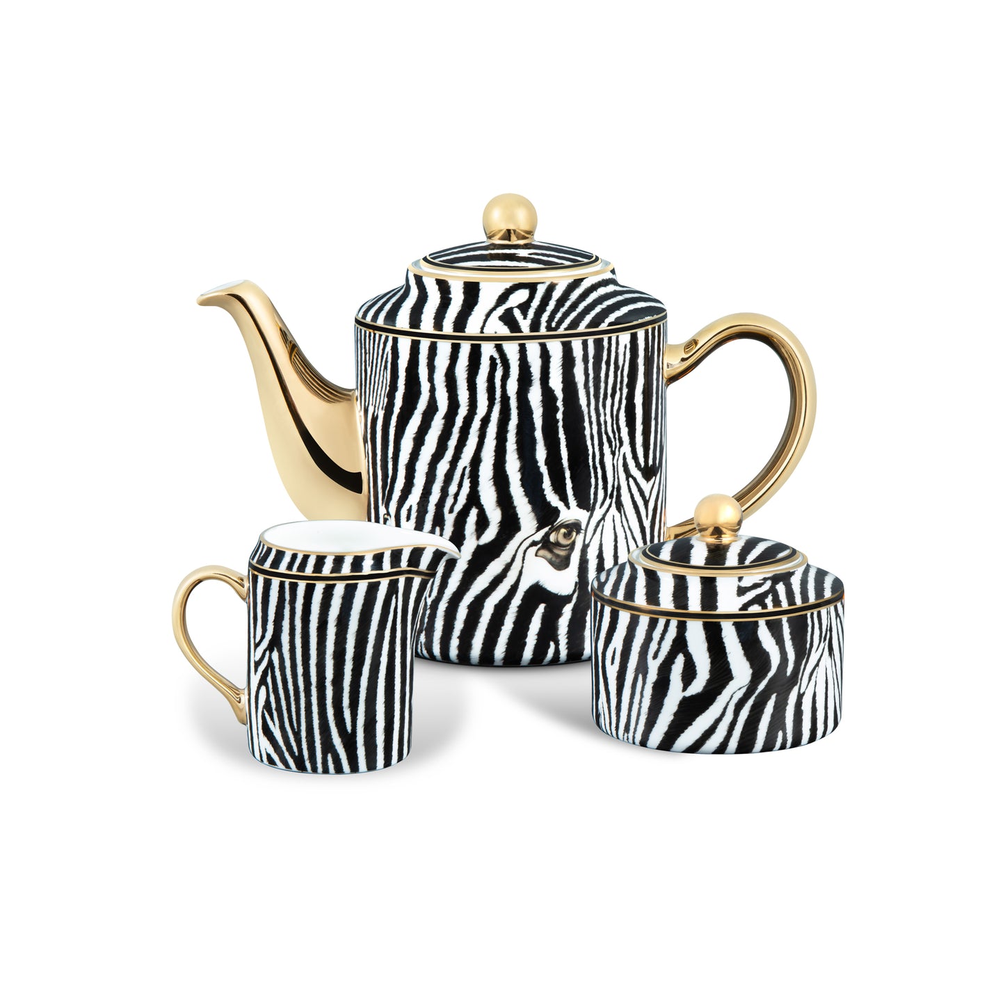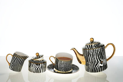 Enhance your teatime ritual with the Zebra Tea & Coffee Set. Crafted from fine bone china, this collection showcases a hand-painted zebra pattern. It features a hidden eye, adding a playful touch and hand painted liquid 24 carat gold handles and spout. It is also hand finished with yellow gold and black trims.