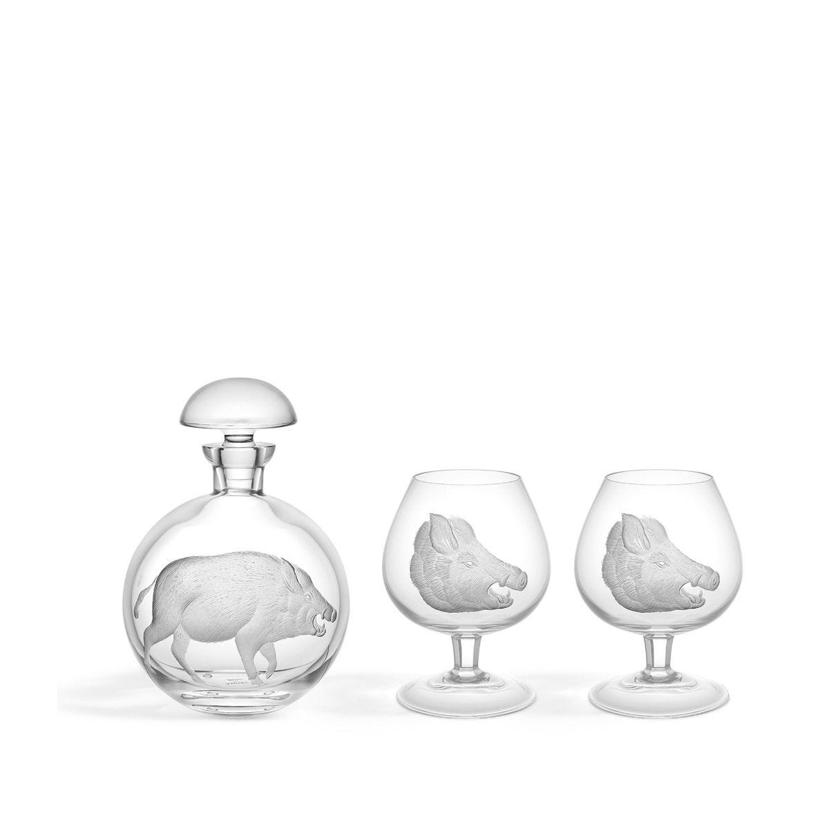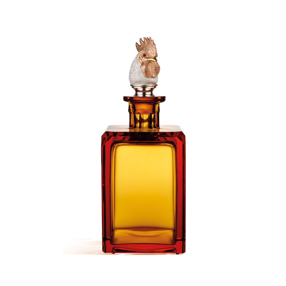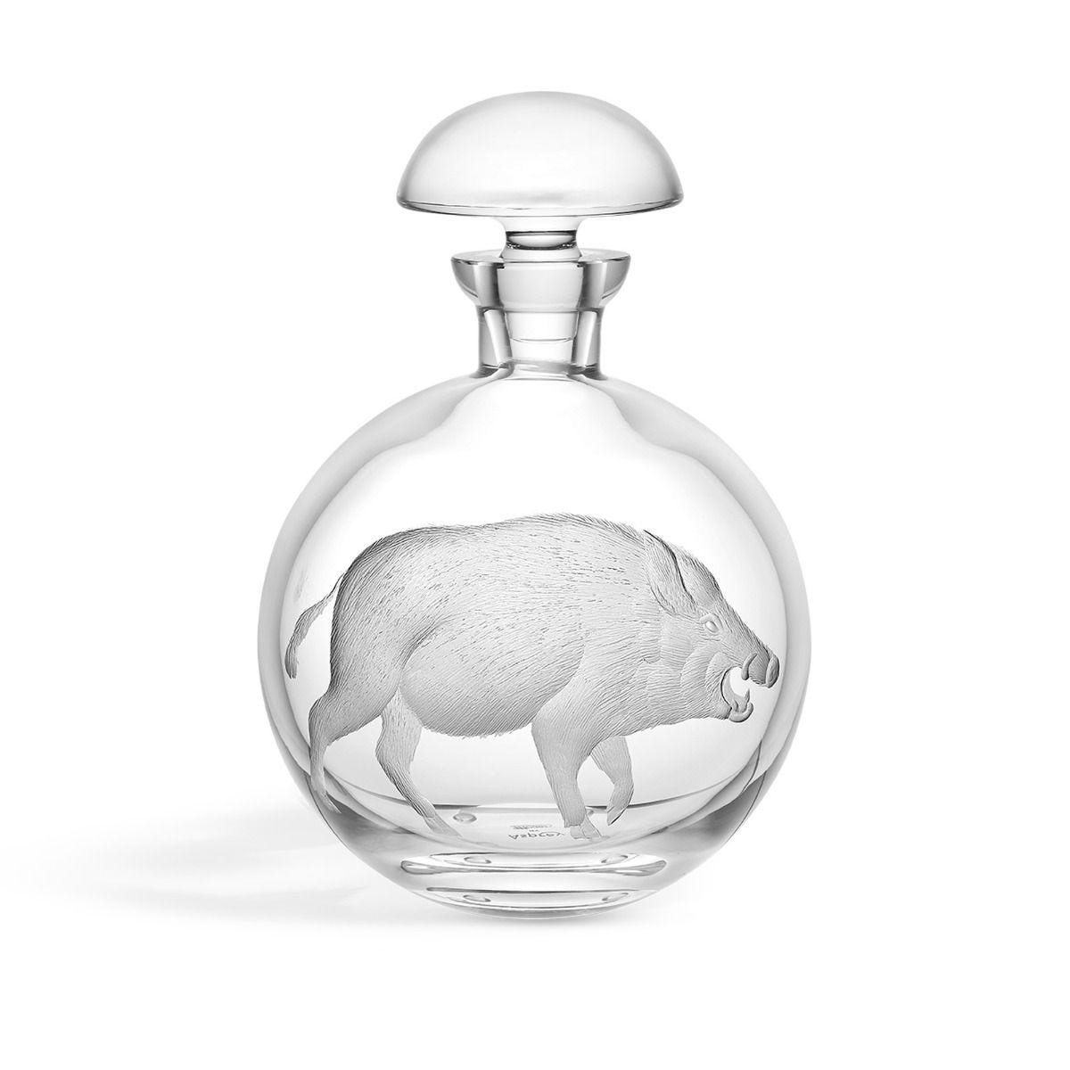 手吹きガラスで作られた鉛フリークリスタル製のAspreyデキャンタ。スターリングシルバーのカラーと、動物やモチーフを彫刻したストッパーが特徴です。エレガントなホームバーにぴったりの、存在感のある逸品です。