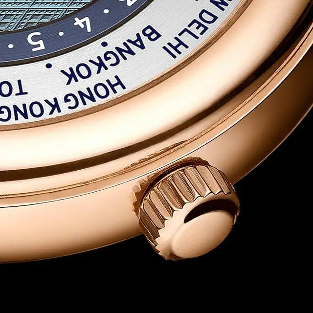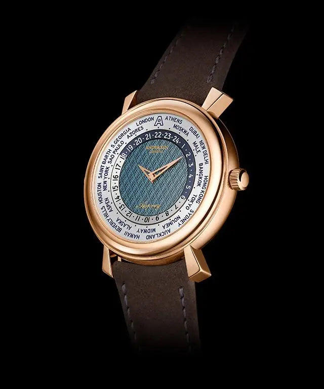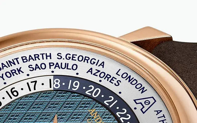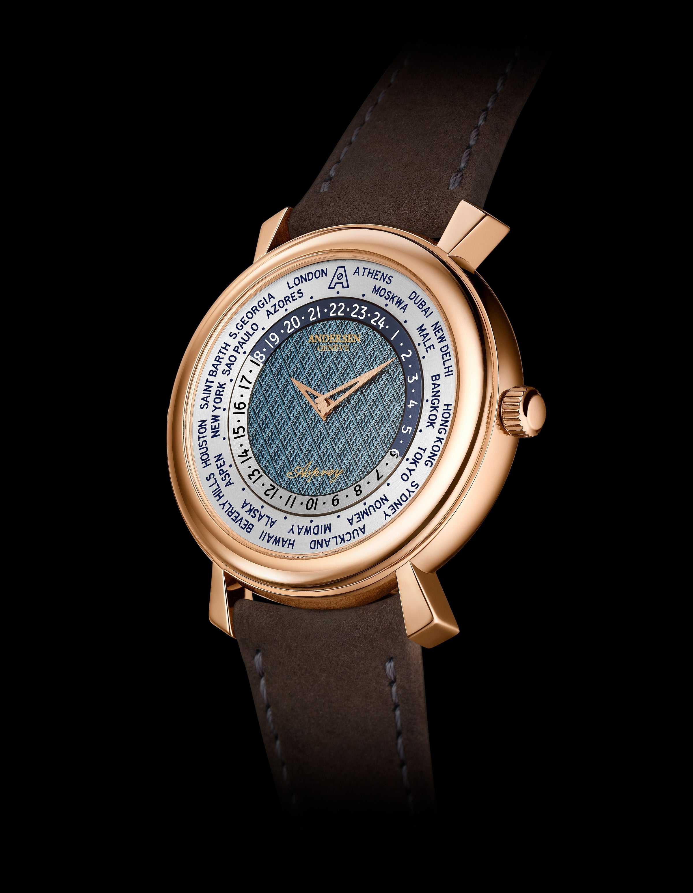 ANDERSEN x Asprey ワールドタイマーは、ピンクゴールドの 4 つの手溶接ラグを備えた 3 つの部分からなるケース構造を誇ります。