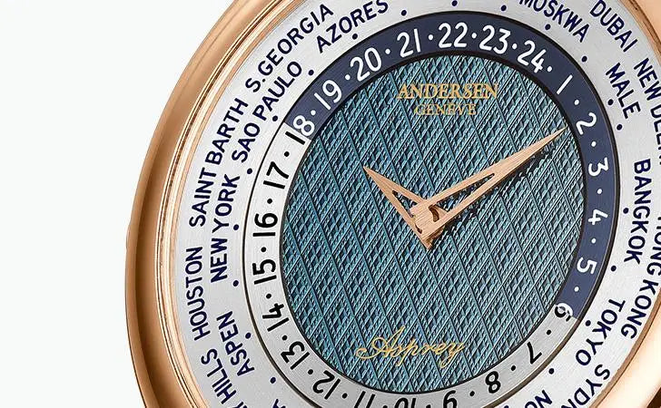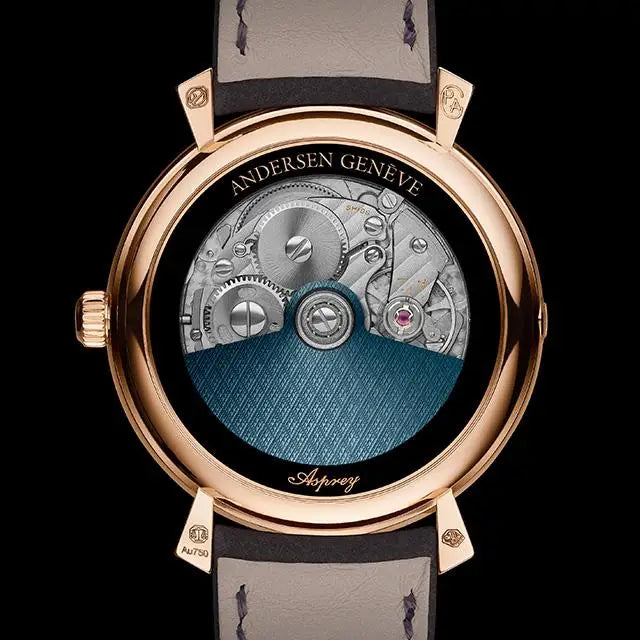 共同ブランド時計の豊かな伝統を持つ Asprey は、メーカー ANDERSEN Genève と並んで、文字盤にゴールドでペイントされたヴィンテージのロゴを復活させました。ブルーゴールドのギョーシェ模様はユニークで、過去のアスプレイのエンジン回転からインスピレーションを得てスヴェン・アンダーセンによって作成され、これまで文字盤には使用されていませんでした。