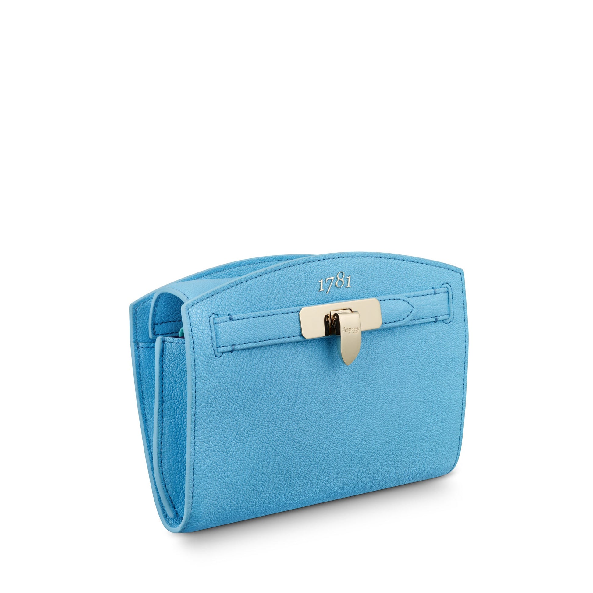 1781 ポシェットは、ブルーの色合いの山羊革の外装が特徴で、どんな服装にも鮮やかな色彩を添えます。内側はラムスキンで裏打ちされており、持つたびに贅沢な感触が味わえます。