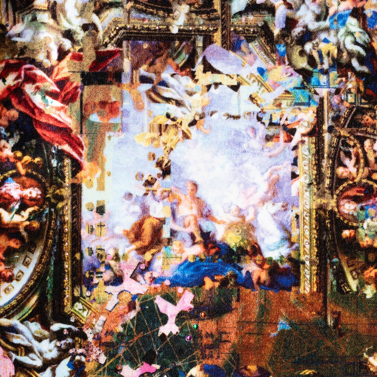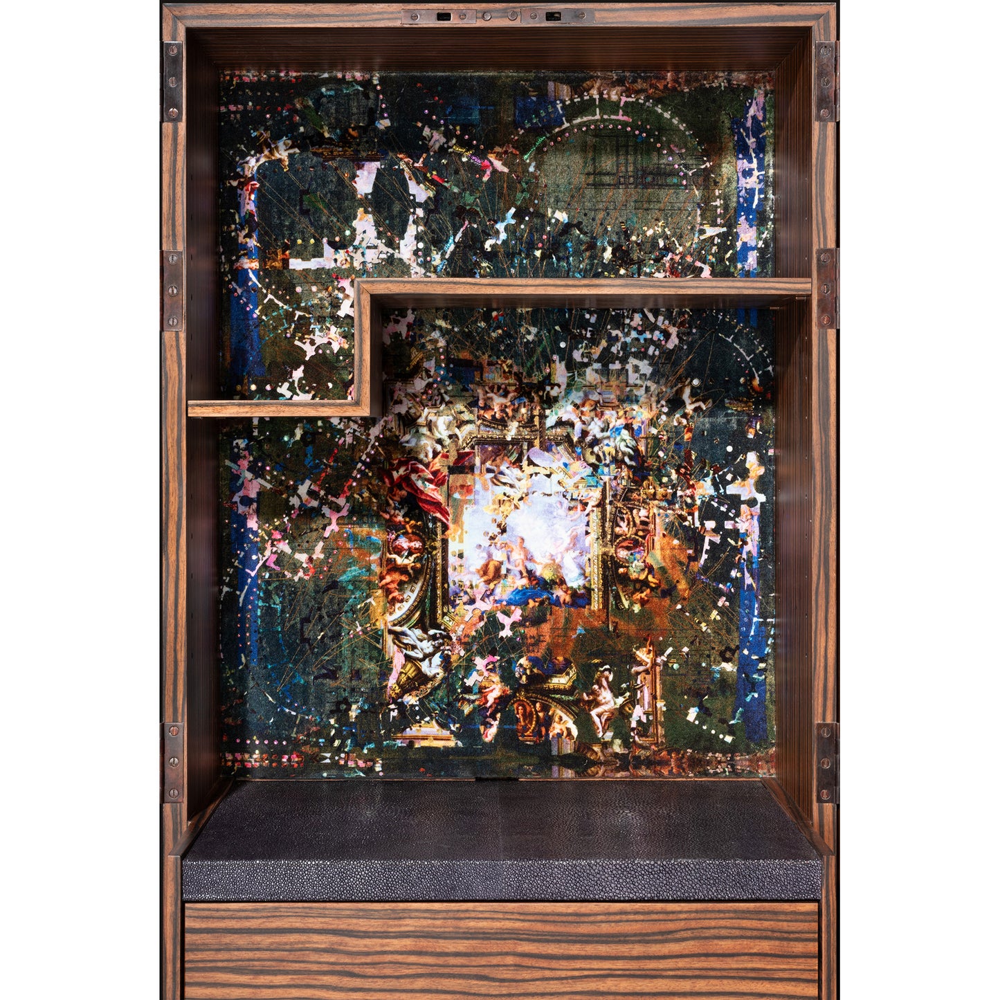 ブラックポップのコレクターズ コレクションから入手した贅沢なコットン ベルベットのバック パネルは、サー ジョン ソーンズ美術館のアーカイブ デザインを再解釈したもので、スワロフスキー クリスタルとメタルの刺繍で装飾されています。大胆なグラフィックのアブサン ボトルが内部のドアを飾り、アール デコ時代のワイルドな夜会の雰囲気を醸し出しています。これらのデザインはキャビネットの下部のボトル ストレージからシームレスに広がり、見る人の目を実在のスピリッツから神話のスピリッツへと導きます。