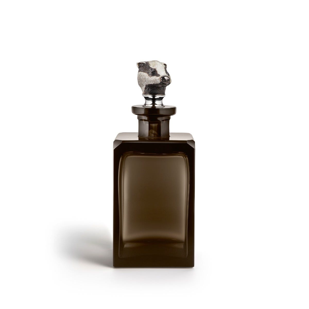 スターリングシルバーのアナグマヘッドストッパーが特徴の鉛フリーのスモーククリスタルデカンタ。 Asprey Londonのワークショップで手作りされています。