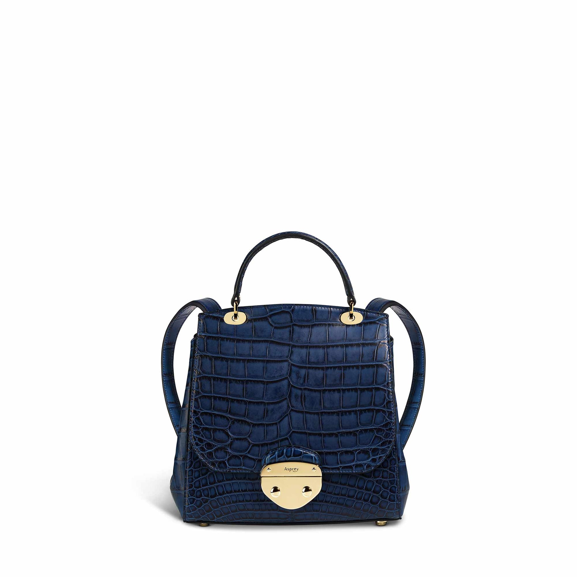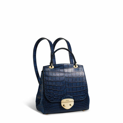 絶妙なブルーのワニ革で作られたこのバックパックは、Belle コレクションの中でも傑出した一品です。スタイルと機能性の両方を考慮してデザインされており、簡単にアクセスできる背面のフラットポケットと、整理して収納できるジップポケットとスリップポケットを備えた広々としたキッズスエードの内装が特徴です。磨かれた淡いゴールドの Asprey ロックと金具が洗練された雰囲気を加えています。