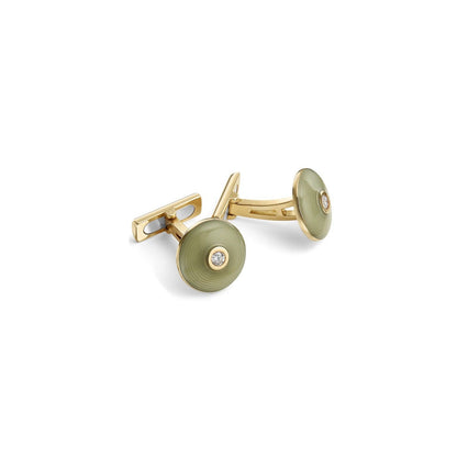 印象的なドーム型のエナメルデザインを誇る、Asprey の絶妙なカフリンクスでスタイルを高めましょう。各カフリンクスには、中央に輝く天然ダイヤモンドがセットされ、その周りを半透明のオリーブ グリーンのエナメルが囲み、すべて 18K イエロー ゴールドにエレガントにセットされています。