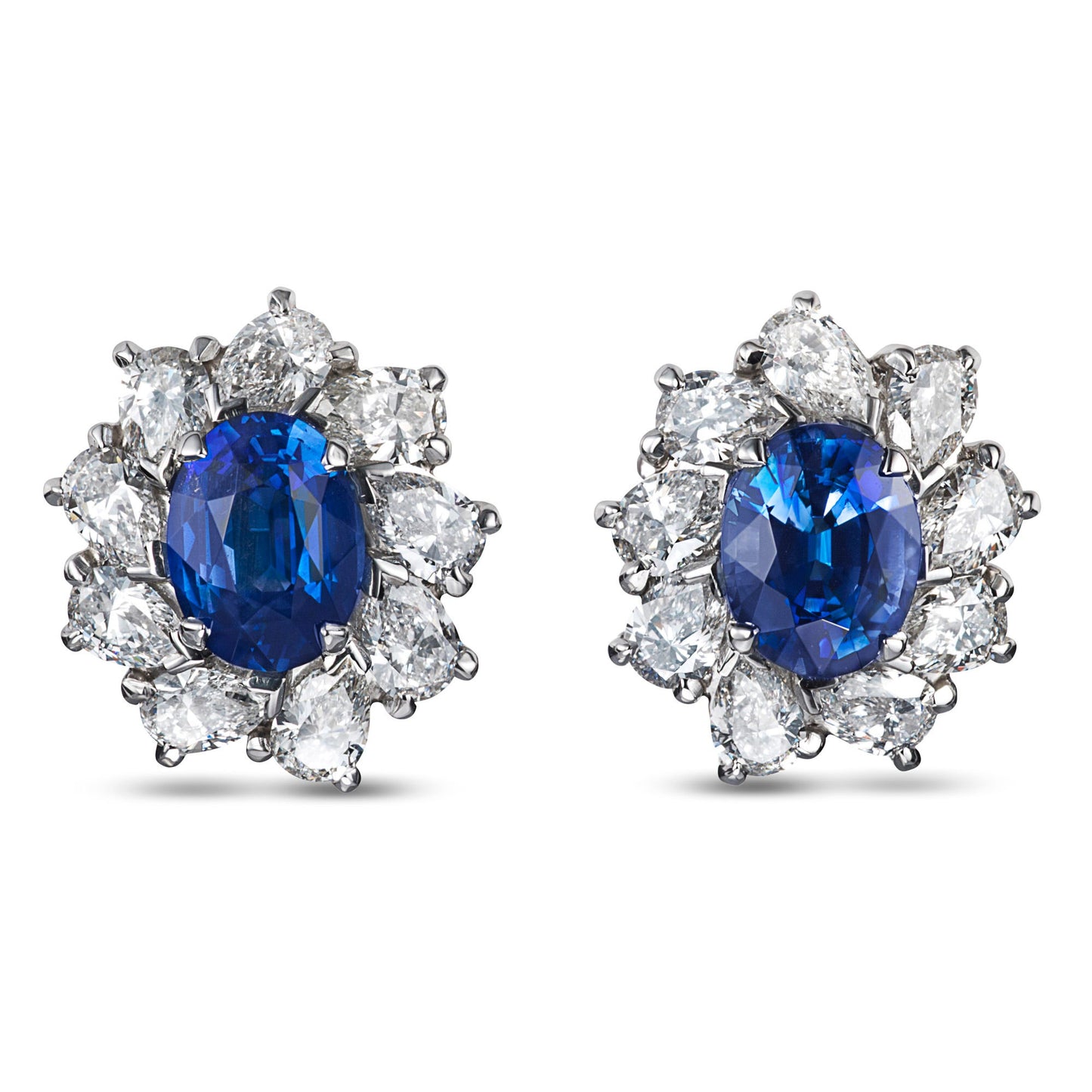 ダイヤモンドに囲まれた楕円形のサファイア、プラチナにセット
