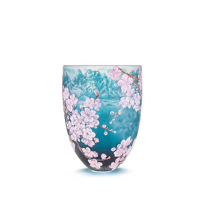 この結晶の中に、春の美しさを描いた物語が展開します。外側を飾る繊細な桜の花は、内側の層に彫られた遠くの山々の複雑なシルエットと絡み合い、極めて精密に手彫りされています。