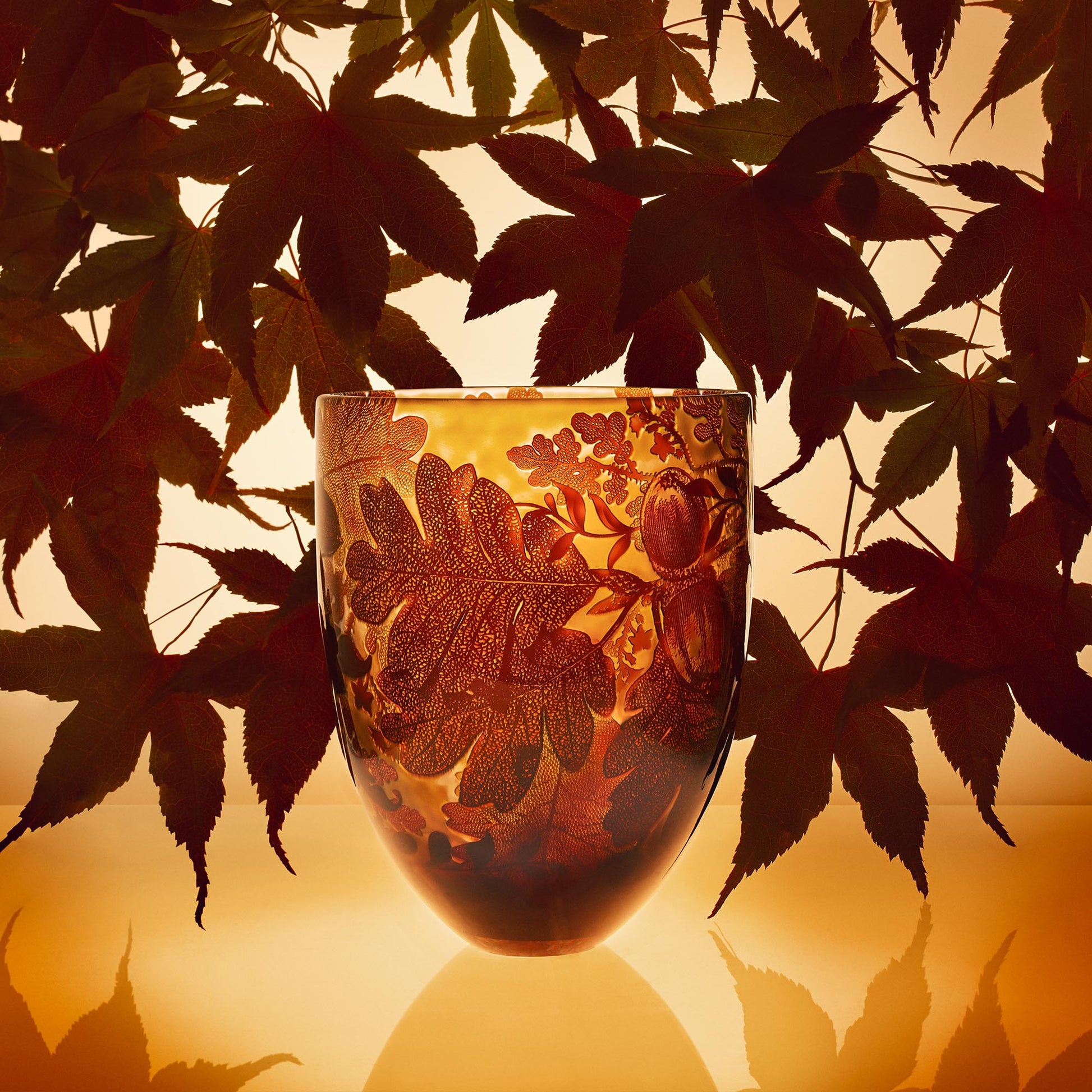口吹きガラスで、透明感のあるガラスの色彩を幾重にも重ねて作られたこの花瓶は、純粋な色彩の層が幾重にも重なり、彫刻のためのキャンバスを作り出します。内側の表面は、色彩の層を通して精巧に彫刻され、魅惑的なカメオのようなレリーフ効果を生み出します。コレクションの各作品は真に唯一無二のものであり、制作には20~25時間という膨大な時間を要します。