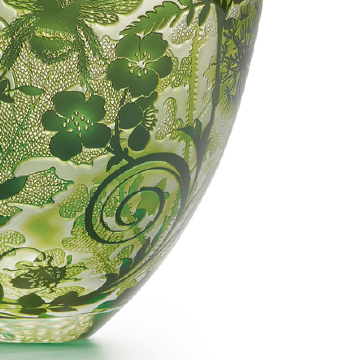 口吹きガラスで、透明感のあるガラスの色彩を幾重にも重ねて作られたこの花瓶は、純粋な色彩の層が幾重にも重なり、彫刻のためのキャンバスを作り出します。内側の表面は、色彩の層を通して精巧に彫刻され、魅惑的なカメオのようなレリーフ効果を生み出します。コレクションの各作品は真に唯一無二のものであり、制作には20~25時間という膨大な時間を要します。