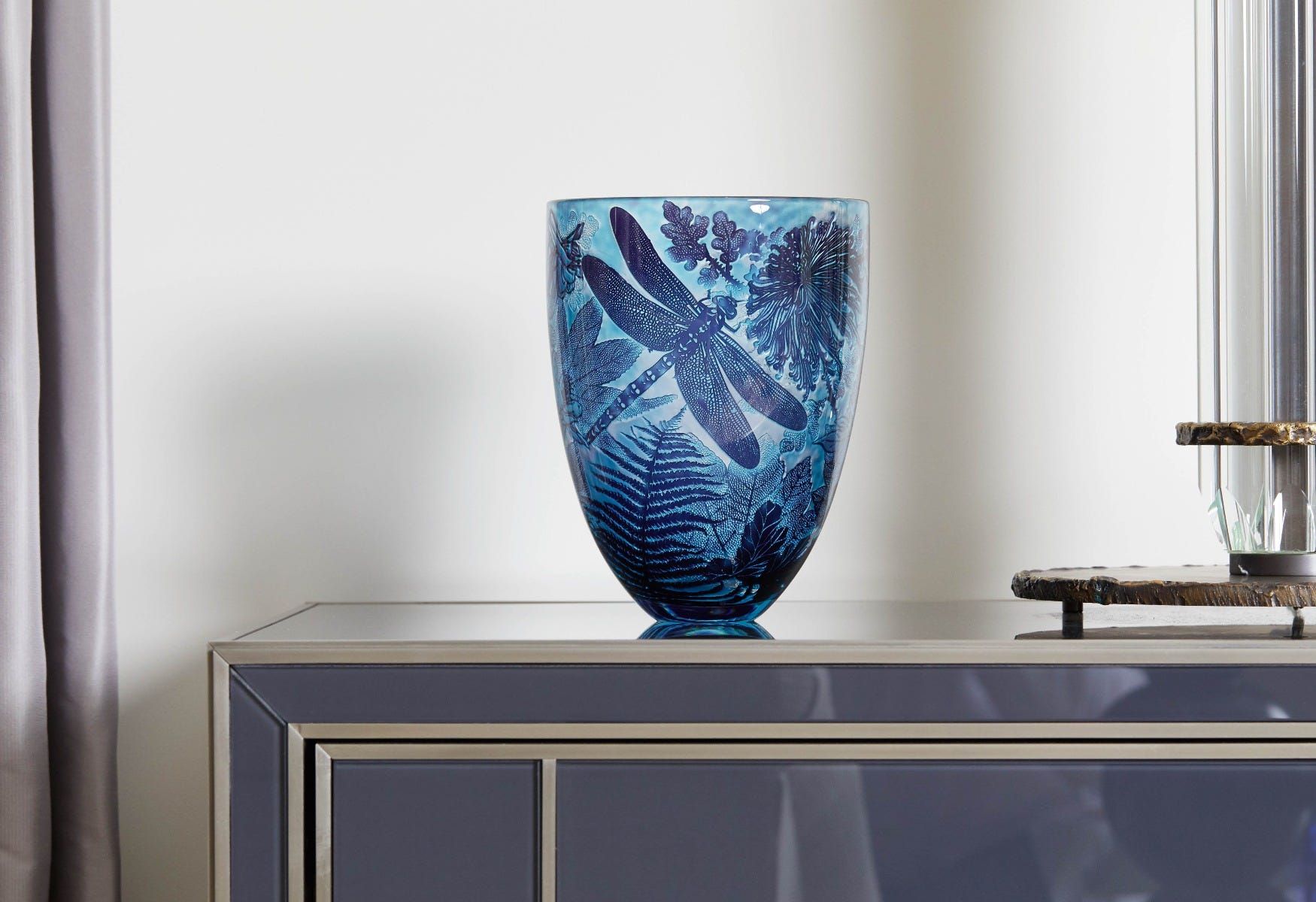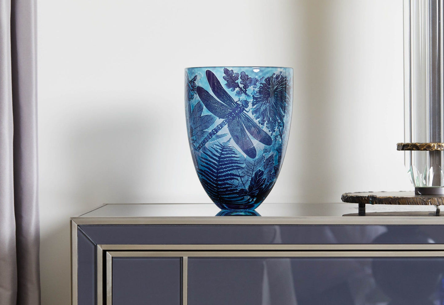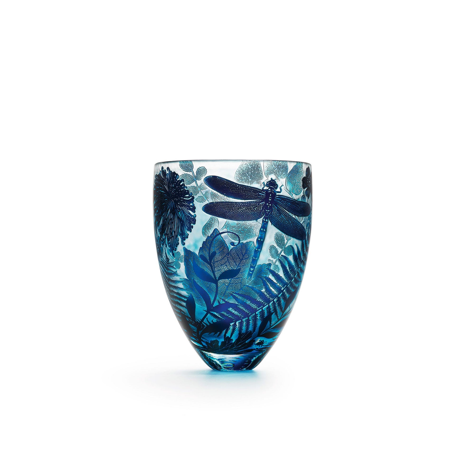 フォーシーズンズ・コレクションの一つであるこの花瓶は、鮮やかなブルーの色合いで、夏の明るい空を象徴し、イギリスの夏の田園地帯の活気に満ちたエッセンスを体現しています。それぞれの花瓶には、モリフォリウム、クモギク、オダマキ、シダといったイギリスを象徴する植物が彫刻されています。また、イギリスの夏の昆虫として人気のヒメアカタテハ、アゲハチョウ、トンボも描かれています。イギリスの夏の定番であるツバメも彫刻されています。