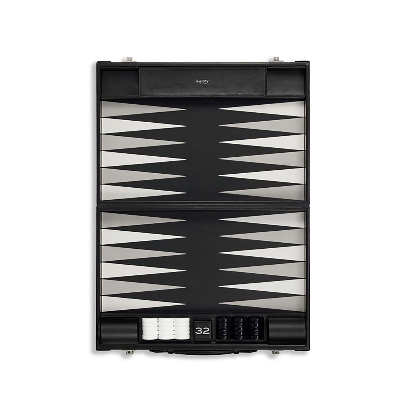 ブラックのイングリッシュサドルレザー製の小型バックギャモンボード、精密ダイス、カウンター、ダイスカップ、ダブリングキューブ付き