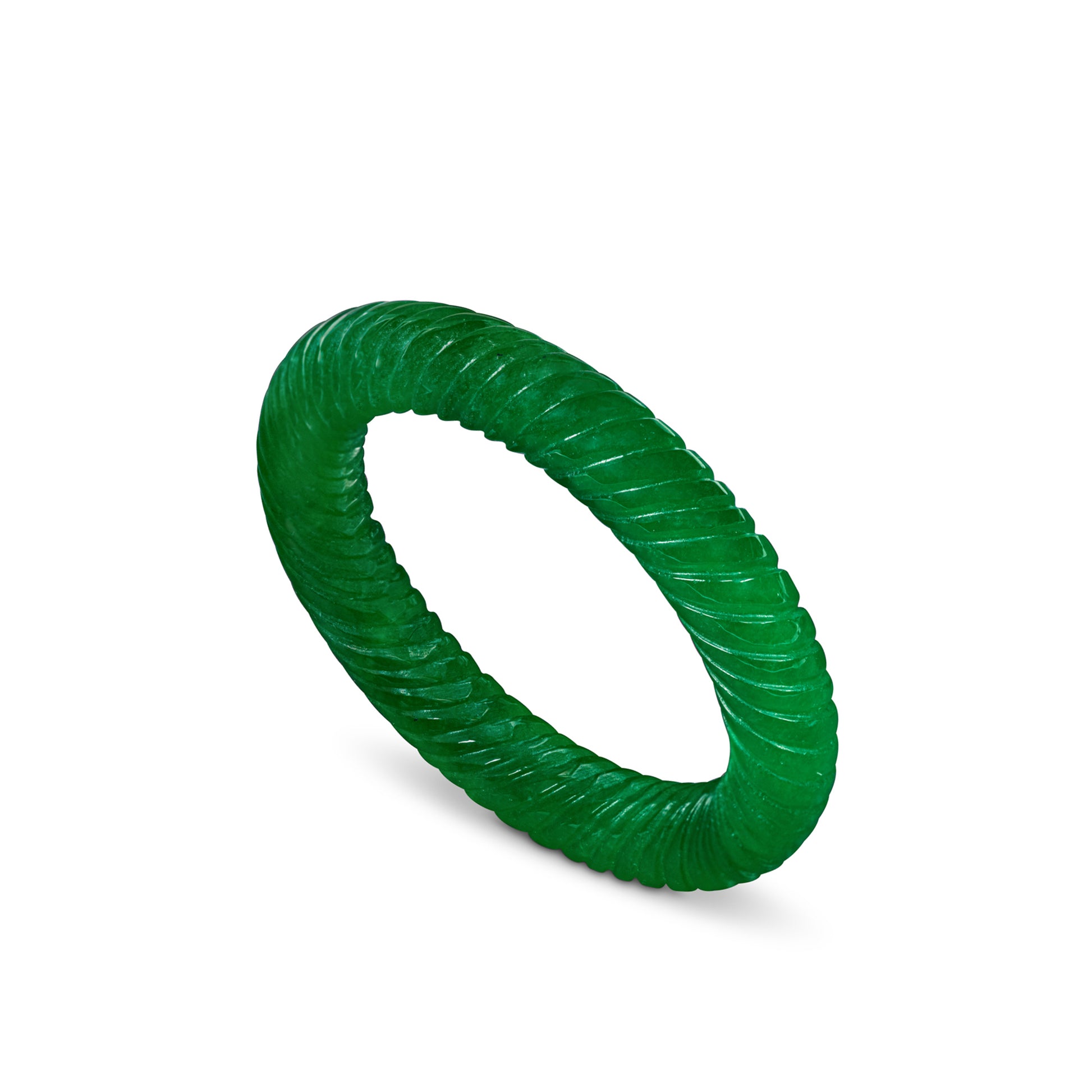 この優美なバングルは、約397カラットの鮮やかなインペリアルジェダイトを巧みに螺旋状に彫刻し、石の比類なき透明感と深みのあるグリーンの色合いを際立たせています。ジェダイトの自然な美しさを際立たせると同時に、アスプレイの宝石職人の卓越した技術と時代を超越したデザインを体現しています。大胆でありながらエレガントなこのバングルは、アスプレイが誇る洗練さと伝統を体現しています。